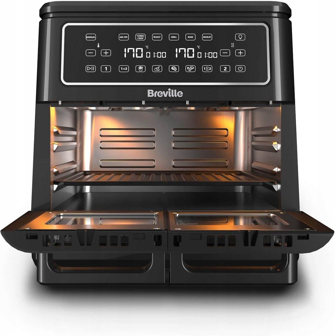 Breville VDF130X Poznaj Breville VDF130X - budowa urządzenia: 1. Panel sterowania 2. Komora (komory) gotowania 3. Szuflada do przechowywania 4. Kosz (x2) ze zdejmowanym uchwytem 5. Tacka przepływu powietrza (x2) 6. Małe (x2) i duża (x1) blacha do pieczenia 7. Małe tace siatkowe (x2) Dzięki Breville …