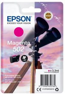 Atrament 502 Lornetka, pojedyncze opakowanie, Magenta Czterokolorowy zestaw atramentów firmy Epson to niedrogie, ale niezawodne rozwiązanie do drukowania, które powstało w oparciu o skrupulatne prace projektowe prowadzone przez Epson. Zestaw 502 został zoptymalizowany pod kątem współpracy z drukarkami Epson, aby za jego pomocą można było zawsze uzyskać wyraźne wydruki o żywych kolorach. Może być stosowany do druku różnego rodzaju dokumentów z drobną czcionką i grafikami. Niezawodne rozwiązanie w przystępnej cenie Ciesz się niezawodnym i wyrazistym drukiem w intensywnych barwach przy minimalnych wydatkach, który zapewnia czterokolorowy zestaw atramentów 502 firmy Epson. Dzięki połączeniu kolorowych atramentów barwnikowych z czarnym atramentem pigmentowym ten zestaw tworzy wyraźne i kolorowe wydruki. Zoptymalizowane do pracy z drukarkami Epson Atramenty i papier firmy Epson przygotowano tak, aby w użyciu z drukarkami Epson za każdym razem dawały najlepsze rezultaty. Oryginalny produkt Dzięki oryginalnym atramentom firmy Epson możesz cieszyć się bezproblemowym i niezawodnym drukowaniem. Prowadzimy szeroko zakrojone badania, inwestujemy w zaawansowane technologicznie zakłady produkcyjne i poddajemy nasze wyroby rygorystycznym testom, aby oferować naszym klientom produkty najwyższej jakości. POZOSTAŁE KOLORY Z TEJ SERII: