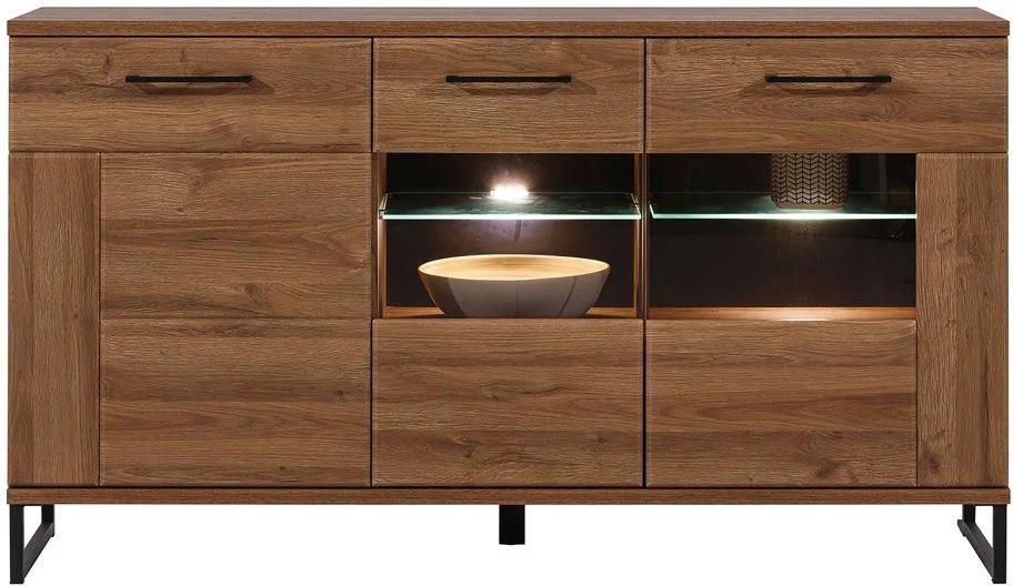 Kredens IVO IV-4 to praktyczne połączenie komody z kredensem, które zapewni sporo miejsca na przechowanie domowych akcesoriów w salonie lub jadalni.Wnętrze kredensu skrywa bowiem za zamykanymi drzwiami kilka pojemnych wnęk. Duża powierzchnia użytkowa blatu pozwala na wyeksponowanie pięknych dekoracji. Posiadając w standardzie podświetlenie LED, szklane półki i fronty podkreślą światło oraz nadadzą pomieszczeniu niezwykły klimat. Geometryczny wzór na froncie mebla, czarne uchwyty i zjawiskowa faktura drewna łączy elegancką klasykę z nutką industrialnego stylu. Całość osadzona została na charakterystycznych czarnych nogach, które nie tylko podkreślają eleganckie wykończenie kredensu, ale jednocześnie nadają mu lekkości. Kredens idealnie sprawdzi się w kompozycji z innymi bryłami z serii IVO lub jako pojedynczy mebel, który można dopasować do własnej aranżacji pomieszczenia.