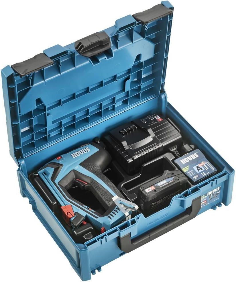 Zszywacz akumulatorowy Novus J-550 Profi - zestaw metaBOX Wydajny, profesjonalny zszywacz akumulatorowy do doskonałego mocowania szerokiej gamy tkanin, tkanin i listew dekoracyjnych na placu budowy i w warsztacie. Dostawa w praktycznej walizce systemu metaBOX, zawierającej 1 akumulator CAS 18 V i …