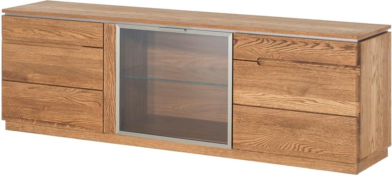 Komoda 3-drzwiowa do salonu i pokoju dziennego z opcjonalnym oświetleniem. Pojemna i ciekawie zaprojektowana szafka pod telewizor. Przeszklenie jednej części pięknie wyeksponuje znajdujące się wewnątrz sprzęty RTV, ozdoby i pamiątki. Kolor: dąb rustical z elementami stali szczotkowanej Front: …