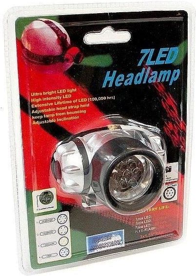 Latarka diodowa LED na czoło, 7 diod, 3 tryby świecenia, na baterie 3xAAA; 18x13x8,5cm, B/C Wymiary: 165x174 mm Opakowanie: blister