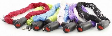 BLOKADA ROWEROWA - ZAPIĘCIE ROWERU - ŁAŃCUCH Z KŁÓDKĄ - idealna do zabezpieczenia roweru przed niepowołanym użytkownikiem Blokada rowerowa - zapięcie roweru: Bardzo solidne i wytrzymałe zapięcie do roweru, wykonane z łańcucha ze stali hartowanej. Ogniwa łańcucha mają średnicę 8 mm! Łańcuch umieszczony w oplocie z miękkiego, wodoodpornego tworzywa, zabezpieczającego pojazd przed ewentualnym zarysowaniem. W komplecie dwa kluczyki. Blokada posiada zabezpieczenie zamka, dzięki czemu nie ulegnie on zanieczyszczeniu i nie dostanie się do niego woda. Długość zapięcia 90 cm, grubość 29 mm, średnica ogniw łańcucha 8 mm. Blokady dostępne są w sześciu kolorach: czerwonym, żółtym, czarnym, różowym, niebieskim i fioletowym.