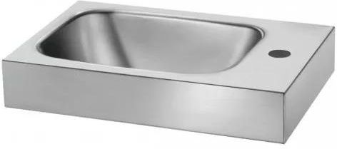 umywalka do WC, 450 x 300 mm designerska umywalka inox 304 bakteriostatyczny wykończenie satynowe grubość Inoxu: 1,2 mm wykończenie z ochroną przed skaleczeniem z otworem na armaturę Ø35 z prawej strony dostarczana z korkiem 1"1/4 bez przelewu dostarczana z mocowaniami znak CE. Produkt zgodny z normą PN-EN 14688 kolor: inox satynowy
