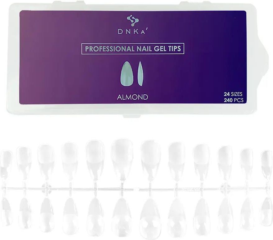 DNKa Formy Do Paznokci Professional Nail Gel Tips Almond, 240pcs DNKa' Professional Nail Gel Tips to produkt, który zapewnia szybkie i niezawodne przedłużanie paznokci, znacznie upraszczając i przyspieszając ten proces. Te cienkie, ale mocne końcówki na bazie żelu są elastyczne i wytrzymują codzienne użytkowanie, zachowując jednocześnie naturalną architekturę płytki paznokcia, a także chroniąc naturalną płytkę paznokcia. Są łatwe w skracaniu i piłowaniu, dzięki czemu są idealne dla klientek, które obgryzają paznokcie. DNKa' Professional Nail Gel Tips zostały stworzone, by upraszczać i ułatwiać proces przedłużania paznokci, zapewniając jakość i niezawodność. Zestaw każdego kształtu zawiera 12 rozmiarów / 240 sztuk. Almond to naturalny kształt migdałowy. CechyTechnologia aplikacji №1 Przeprowadź standardowe przygotowanie paznokcia: usuń poprzednie pokrycie, spiłuj powierzchnię paznokcia, wykonaj manicure. Technologia aplikacji №2 Nałóż DNKa' Ultrabond dla dodatkowej przyczepności. Technologia aplikacji №3 Nałóż wcierając warstwę DNKa' Rubber Base lub DNKa' Multi Base. Utwardź w lampie LED/UV 48W przez 30 sekund. Technologia aplikacji №4 Dobierz tips o odpowiednim rozmiarze do płytki paznokcia i na jego wewnętrzną stronę (strefę kontaktu tipsa z naturalnym paznokciem) nanieś cienką kroplę DNKa' Rubber Base. Technologia aplikacji №5 Przyciśnij tips do płytki paznokcia, stopniowo wypuszczając powietrze. Zostaw odstęp od tylnego wału (eponychium) 1-2 mm i umieść paznokieć w lampie na kilka sekund. Można użyć mini lampy lub lampy-latarki dla wygodnej tymczasowej fiksacji do 10 sekund. Technologia aplikacji №6 Utwardź całą rękę w lampie 48W przez 30-60 sekund. Technologia aplikacji №7 Usuń stopień, jeśli powstał, za pomocą frezarki lub pilnika, wyrównaj przejście, używając DNKa’ Rubber Base, Cover Rubber Base, Liquid Acrygel. Utwardź wyrównującą warstwę w lampie. Technologia aplikacji №8 Nadaj paznokciom kształt pilnikiem o ziarnistości nie większej niż 180 grit. Technologia aplikacji №9 Zalecamy wzmocnienie tipsów za pomocą DNKa' Liquid Acrygel lub DNKa' Builder Gel/Pro Gel. Nałóż kolorowe pokrycie i zabezpiecz je topem.
