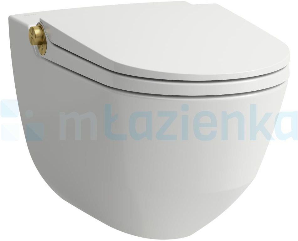 Toaleta myjąca podwieszana RIMLESS: w komplecie z wolnoopadającą deską WC wykonaną z duroplastu z pokrętłem sterującym w kolorze złoty połysk służącym do obsługi funkcji toalety myjącej, system szybkiego demontażu deski ułatwiający czyszczenie pilot z ekranem dotykowym oraz uchwytem naściennym …