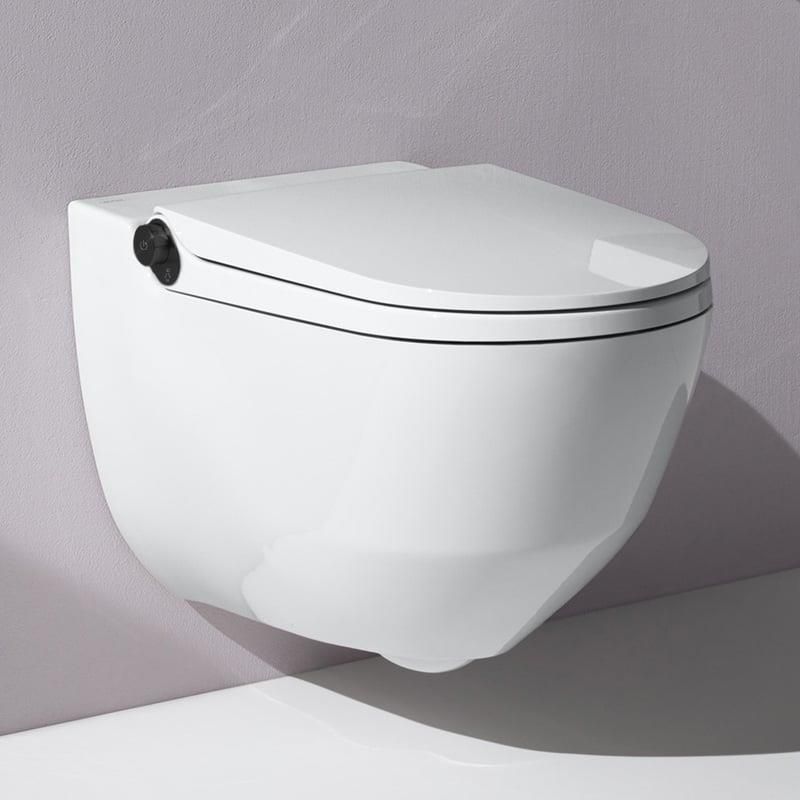 Toaleta myjąca podwieszana RIMLESS: w komplecie z wolnoopadającą deską WC wykonaną z duroplastu z pokrętłem sterującym w kolorze titanium czarny matowy służącym do obsługi funkcji toalety myjącej, system szybkiego demontażu deski ułatwiający czyszczenie pilot z ekranem dotykowym oraz uchwytem …