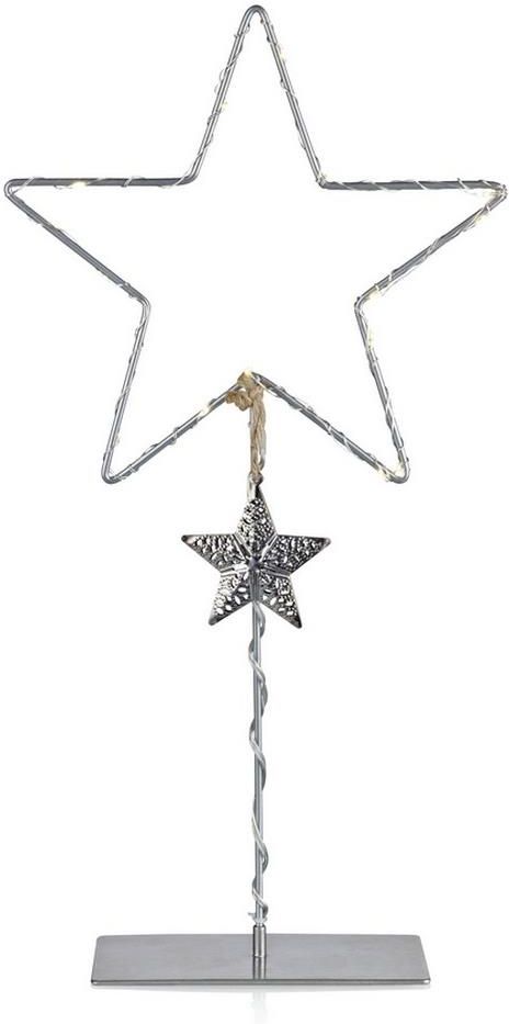 LED Świąteczna, świetlna dekoracja. Do użytku w pomieszczeniach wewnętrznych. Kształt: gwiazda. Kolor: chrom matowy. Funkcja timera. Zasilanie: 3x AA baterie (brak w zestawie).