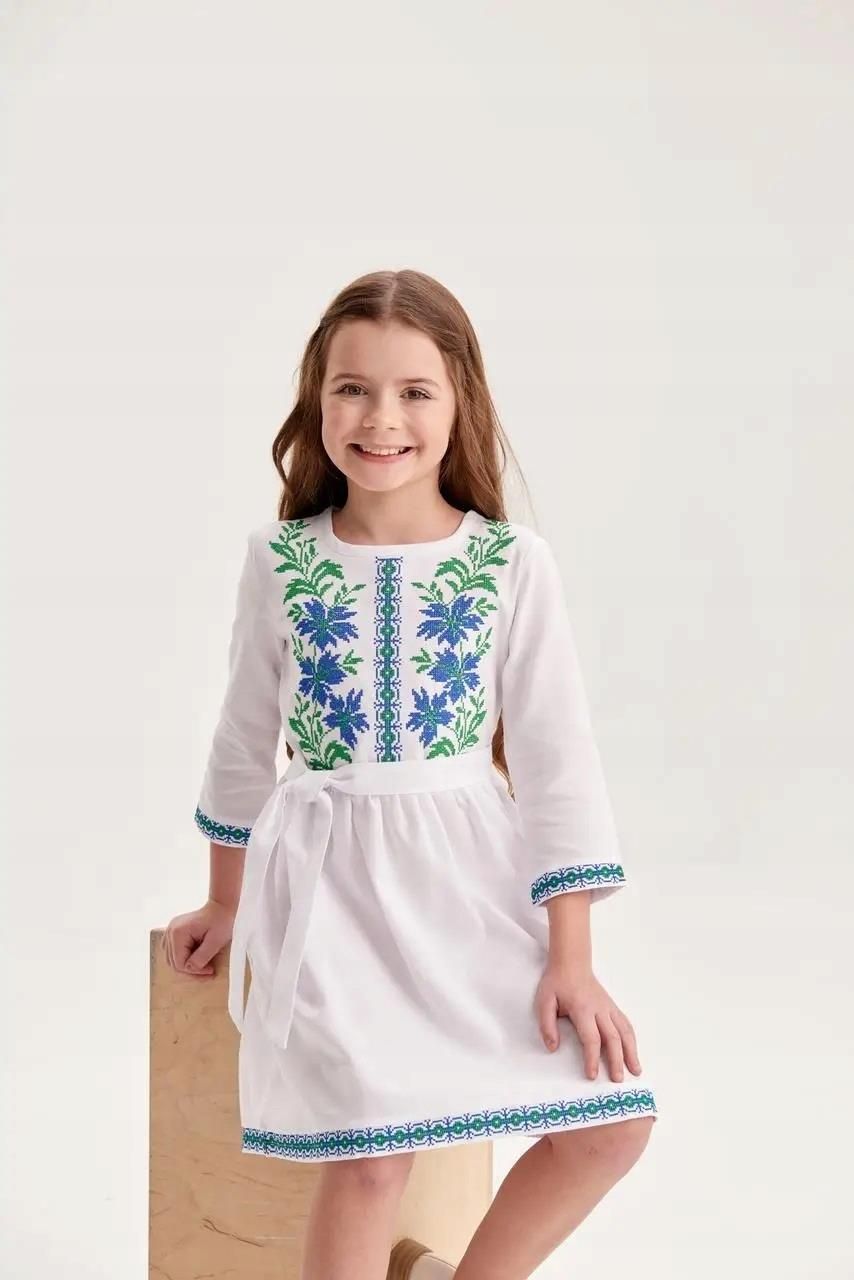 Przepiękna haftowana sukienka dla dziewczynki. Uszyta z bawełny z dodatkiem poliestru, dziecko w niej się nie poci, naturalny materiał nie uczula. Jest lekka i przewiewna. Niepowtarzalna i niebanalna, ludowa sukienka. Haft gładki maszynowy, nie ściąga się po praniu, ma mięciutki spód. Autentyczna i bardzo oryginalna. Rozmiar, szerokość w piersiach, talia, szerokość w ramionach, długośc całkowita 110: 28, 26, 22, 56 116: 29, 27, 23, 58 122: 29,5, 28, 24, 60 128: 31, 29, 26, 62 134: 32, 29, 27, 64 140: 33, 30, 28, 67,5 146: 35, 33, 29, 70 152: 37, 36, 30, 74 Ukraiński producent.