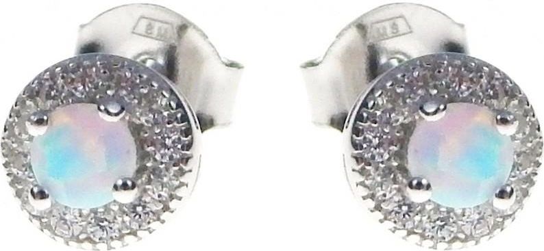 Delikatne rodowane srebrne kolczyki zdobione opalem i cyrkoniami, model V014E.