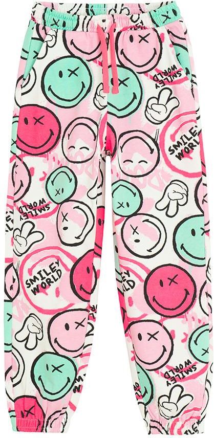 Spodnie dresowe dla dziewczynki: licencja: SmileyWorld Materiał i technologie: 60% bawełna, 40% poliester (gramatura 280 g/m2) polar certyfikat Oeko-Tex Standard 100 Pranie i pielęgnacja: Prać w temperaturze do 40 °C, proces łagodny. Nie bielić. Nie suszyć w suszarce bębnowej. Prasować w temperaturze do 150 °C. Nie czyścić chemicznie. Prać i prasować po lewej stronie. Nie prasować ozdób. ..