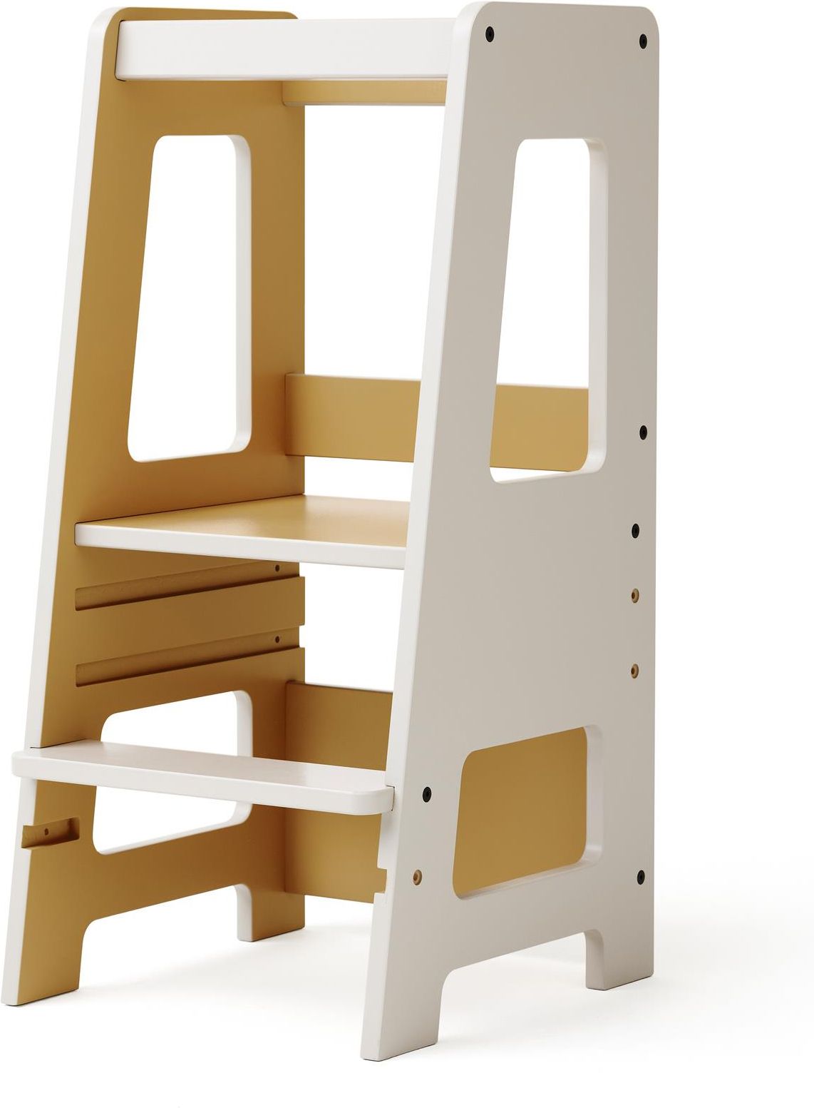 Kitchen helper dla małego pomocnika kuchennego lub wieża Montessori Opis produktu Udział w życiu rodziny podczas gotowania lub zmywania buduje pewność siebie i zamienia codzienne obowiązki w chwile wspólnie spędzonego czasu. Kitchen helper znany też jako wieża edukacyjna Motessori lub kuchenny pomocnik — wykonana jest z drewna z certyfikatem FSC i zaprojektowana dla dzieci w wieku od 1 do 7 lat. Z produktu należy korzystać dopiero wtedy, gdy dziecko potrafi stabilnie i bezpiecznie stać, dlatego minimalny wiek może się różnić w zależności od dziecka. Wieża posiada regulowaną wysokość platformy do stania (trzy poziomy) oraz regulowane stopnie. Wystarczy poluzować boczne śruby i przesunąć platformę lub podstawę na wybrane ustawienie. Na górnych poziomach znajduje się wyjmowana poręcz zabezpieczająca (drążek), która zwiększa stabilność i może zostać zdjęta, gdy dziecko nie będzie już jej potrzebować. Zewnętrzna część jest pomalowana na delikatny szary kolor, a wnętrze ma ciepły musztardowy odcień, co tworzy czysty i stylowy kontrast. Stabilna i solidna konstrukcja bezpiecznie podnosi dziecko do wysokości blatu lub zlewu, zachęcając do pomocy w gotowaniu, zmywaniu czy przygotowywaniu przekąsek — oraz do udziału w rodzinnych rytuałach z poczuciem prawdziwej odpowiedzialności i samodzielności. Najważniejsze cechy Regulowana platforma i stopnie: dopasowanie od malucha po wczesny wiek szkolny dzięki trzem wysokościom platformy i podestu. Wspiera realne zaangażowanie: pozwala dzieciom bezpiecznie uczestniczyć w domowych zadaniach i uczy samodzielności od najmłodszych lat. Wyjmowana poręcz (drążek) z tyłu na górnych poziomach: daje większe poczucie bezpieczeństwa na początku, a potem można ją łatwo zdemontować, gdy dziecko nabierze pewności. Certyfikaty i materiały Korpus: MDF. Górna poręcz zabezpieczająca: topola. Rodzaj farby: farba na bazie wody. Certyfikat FSC Parametry Wymiary: (dugość/szerokość/wysokość) 42 x 45 x 90 cm Maksymalne obciążenie: 30 kg Waga: 11980 g Instrukcja pielęgnacji Czyścić wilgotną ściereczką. Wytrzeć do sucha czystą szmatką.