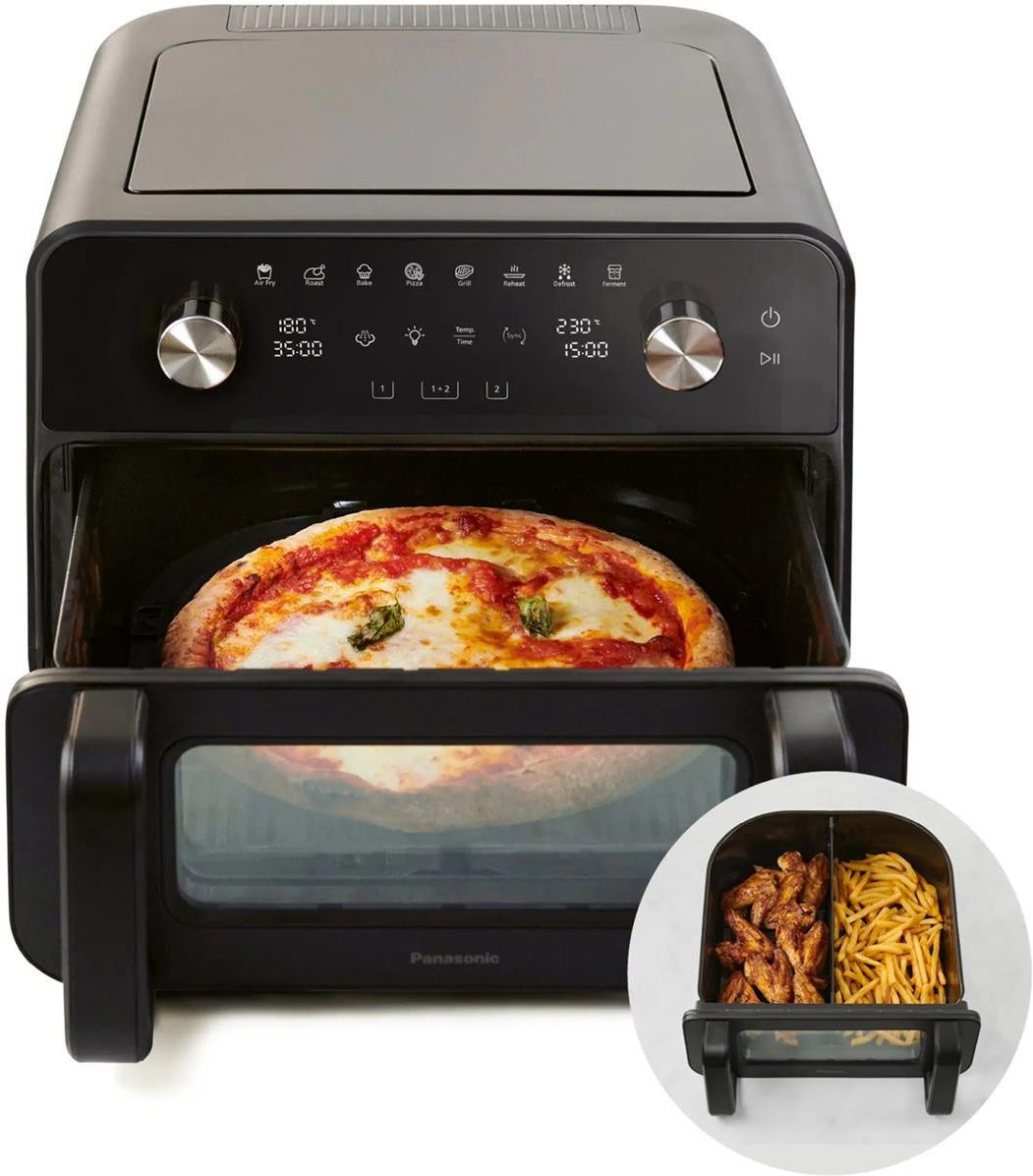 Uniwersalny koszyk (9,6 l) mieszczący całą pizzę o średnicy 30 cm, z okienkiem i oświetleniem Technologia gotowania na parze Gentle Steam pozwala uzyskać soczyste i chrupiące potrawy Technologia przepływu powietrza 360° 8 wstępnie ustawionych automatycznych menu 35–230°C (2 górne elementy grzewcze i 1 dolny) Koszyk, patelnia grillowa i przegroda – żaden z elementów nie zawiera PFAS NF-BC1000 Uniwersalny koszyk. Jedna strefa. Dwie strefy. Postaw na większą elastyczność w gotowaniu dzięki frytkownicy beztłuszczowej Panasonic FLEX. Ciesz się dużym koszykiem o pojemności 9,6 litra, który pomieści pizzę o średnicy 30 cm. Możesz też podzielić koszyk, aby utworzyć dwie strefy, które można zsynchronizować tak, aby gotowanie zakończyło się w tym samym czasie. Dzięki temu zyskasz więcej możliwości przygotowania posiłków dla rodziny i bliskich. Technologia gotowania na parze Gentle Steam i smażenie z przepływem powietrza 360° pozwalają przygotowywać soczyste, chrupiące posiłki w zdrowy sposób, przy użyciu mniejszej ilości oleju lub całkowicie bez oleju. Możesz też obserwować proces gotowania przez okienko z oświetleniem. Funkcje Dowiedz się, co zyskujesz dzięki frytkownicy beztłuszczowej FLEX • Duży, elastyczny koszyk (9,6 l, 30 x 30,8 x 10,7 cm) • Wystarczająco duży, aby pomieścić całą pizzę o średnicy 30 cm • Wyjmowana przegroda umożliwiająca utworzenie 2 stref gotowania • Zsynchronizowane gotowanie, dzięki czemu posiłki można przygotować w tym samym czasie • Praktyczne okienko z oświetleniem • Technologia gotowania na parze Gentle Steam do przygotowania soczystych i chrupiących potraw • Przepływ powietrza 360° Air Flow dla zdrowszego smażenia z mniejszą ilością oleju • 2 górne elementy grzewcze i 1 dolny • Szeroki zakres temperatur 35–230°C • Koszyk, talerz na potrawy chrupiące i przegroda — żaden z elementów nie zawiera PFAS • Talerz na potrawy chrupiące i przegroda nadają się do mycia w zmywarce Uniwersalny koszyk. Jedna strefa. Dwie strefy. Koszyk o pojemności 9,6 litra jest wystarczająco duży, aby przygotować w nim pizzę o średnicy 30 cm, całego kurczaka lub więcej potraw, tak jak lubisz. Pomieści nawet prostokątne naczynie żaroodporne/do lasagne. Można też użyć wyjmowanej przegrody, aby podzielić koszyk i stworzyć dwie strefy gotowania, z których każda może być ustawiona na indywidualną temperaturę i czas. Dzięki temu możesz przygotować cały posiłek za jednym razem, na przykład mięso, rybę i warzywa. Pomieści całą pizzę o średnicy 30 cm Nie musisz rozgrzewać tradycyjnego piekarnika – szybko upiecz całą mrożoną pizzę o średnicy 30 cm lub przygotuj do 800 g chrupiących frytek w frytkownicy beztłuszczowej FLEX Air Fryer. Koszyk o pojemności 9,6 litra (30 x 30,8 x 10,7 cm) pomieści 14 dużych skrzydełek kurczaka, zapiekankę, a nawet duże ciasto. Dwie strefy. Kompletny posiłek. Dwie strefy gotowania Za pomocą wyjmowanej przegrody możesz podzielić koszyk na dwie strefy. Do każdej strefy możesz włożyć inne produkty spożywcze, np. warzywa do jednej, a kurczaka i rybę do drugiej – lub też jedna strefa może być przeznaczona dla dzieci, a druga dla rodziców. Każda strefa może być również ustawiona do gotowania przy użyciu różnych wstępnie ustawionych menu, różnych temperatur i różnych czasów gotowania. Zsynchronizowane gotowanie Zsynchronizuj obie strefy, aby przygotowywać posiłki w tym samym czasie. Mięso gotuje się dłużej niż warzywa, ale obiad powinien być ciepły i gotowy w tym samym czasie. Wystarczy nacisnąć przycisk Sync, a gotowanie w obu strefach zakończy się w tym samym czasie. Dzięki temu wszyscy mogą wspólnie cieszyć się kompletnym posiłkiem – szybko i łatwo. Zaoszczędź nawet 55% energii i czasu gotowania* Ciesz się korzyściami płynącymi z szybszego przygotowywania posiłków i mniejszego zużycia energii dzięki frytkownicy beztłuszczowej Panasonic FLEX Air Fryer. Dzięki kompaktowej konstrukcji i wydajnej technologii grzewczej nie ma potrzeby włączania tradycyjnego elektrycznego piekarnika w zabudowie, aby przygotować smaczne posiłki. Okienko ze światłem Zadbaj o to, aby Twoje dania były pyszne. Okienko kontrolne wykonane ze szkła hartowanego jest w tym przypadku naprawdę przydatne. Dzięki niemu nie musisz ciągle otwierać i zamykać koszyka, powodując utratę ciepła. W ten sposób oszczędzasz energię. Jeśli chcesz, możesz łatwo włączyć lub wyłączyć oświetlenie koszyka. Wstępnie ustawione menu i programowanie ręczne Wybierz jedną z 8 gotowych opcji menu, dotykając panelu: Smażenie na powietrzu, pieczenie, pieczenie ciast, pizza, grillowanie, podgrzewanie, rozmrażanie, a nawet fermentacja w celu przygotowania domowego jogurtu lub do wyrastania chleba. Jeśli chcesz, możesz dostosować działanie urządzenia, ustawiając własną temperaturę i czas – w zakresie od 35°C do 230°C i od 1 do 60 minut. Twoje ulubione potrawy – soczyste i chrupiące Technologia delikatnej pary Frytkownica beztłuszczowa FLEX wykorzystuje technologię gotowania na parze Gentle Steam, dzięki której uzyskasz soczyste i chrupiące potrawy. Do koszyka wtryskiwana jest woda ze zintegrowanego zbiornika, która nawilża powierzchnię potrawy, co jest szczególnie przydatne w przypadku kurczaka lub ryby. Para pomaga również gorącemu powietrzu przewodzić więcej ciepła i bardziej równomiernie je rozprowadza. Używaj technologii Gentle Steam kiedy tylko chcesz, po prostu naciskając przycisk pary. Zbiornik na wodę Duży zbiornik na wodę mieści 200 ml wody i jest płynnie zintegrowany z frytkownicą Air Fryer, nadając jej stylowy, kompaktowy wygląd. Zbiornik na wodę można również wyjąć, co ułatwia dodawanie wody i czyszczenie. Technologia przepływu powietrza 360 Technologia przepływu powietrza 360 Dzięki technologii 360° Air Flow fi