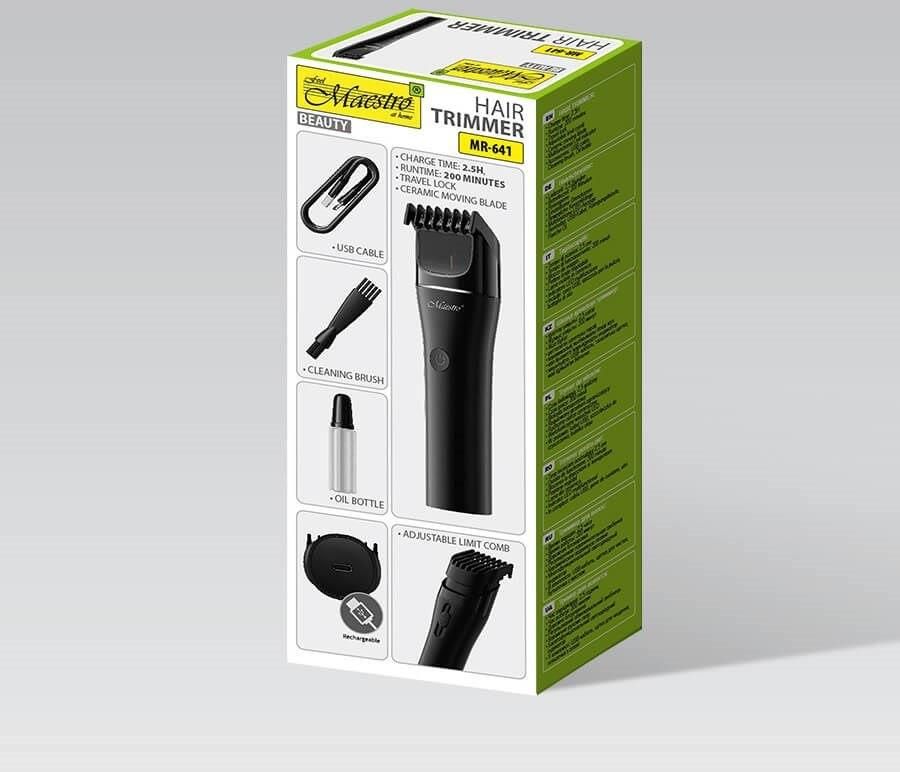 Trymer USB MAESTRO MR-641 - Złoty, Bezprzewodowy, Wydajny Trymer do włosów USB MAESTRO MR-641 to innowacyjne urządzenie, które zrewolucjonizuje Twój codzienny rytuał pielęgnacji włosów. Dzięki bezprzewodowej konstrukcji i nowoczesnemu designowi w kolorze złotym, korzystanie z trymera staje się czystą przyjemnością. Jest on idealnym rozwiązaniem zarówno dla profesjonalnych fryzjerów, jak i dla osób, które cenią sobie wygodę i jakość. Urządzenie działa na litowej baterii, co zapewnia długotrwałe użytkowanie, a funkcja szybkiego ładowania pozwala na pełne naładowanie akumulatora w zaledwie 120 minut. Trymer oferuje szereg funkcji, które sprawiają, że jest on bardzo wszechstronny: Czas pracy: 300 minut Typ ostrza: Stal nierdzewna Minimalna długość włosa: 0,9 mm Maksymalna długość włosa: 6 mm Ilość dostępnych nasadek: 4 Łatwość czyszczenia: Tak Wymiary produktu oraz ergonomiczny kształt sprawiają, że jest on praktyczny oraz wygodny w użyciu: Waga produktu: 250 g Długość przewodu: 2 m Szerokość produktu: 44 mm Wysokość produktu: 160 mm Głębokość produktu: 40 mm W zestawie znajdziesz także ładowarkę akumulatorów oraz szczoteczkę do czyszczenia, co sprawia, że model MAESTRO MR-641 jest kompletnym narzędziem do pielęgnacji włosów. Wybierz trymer, który łączy w sobie nowoczesność, funkcjonalność oraz styl! Bezprzewodowy: Tak Czas ładowania: 3 godz Źródło zasilania: Bateria Ładowarka akumulatorów: Tak Głębokość produktu: 40 mm Materiał ostrza: Stal nierdzewna Minimalna długość włosa: 0,9 mm Łatwość czyszczenia: Tak Szerokość opakowania: 205 mm Szybkie ładowanie: Tak Szczoteczka do czyszczenia: Tak Waga wraz z opakowaniem: 630 g Czas pracy: 300 min Waga produktu: 250 g Wysokość opakowania: 65 mm Rodzaj baterii: Litowa Czas szybkiego ładowania: 120 min Kolor produktu: Złoty Pojemność baterii: 1400 mAh Ładowanie przez łącze USB: Tak Rodzaj opakowania: Pudełko Szerokość produktu: 44 mm Praca na mokro i sucho: Nie Typ kontroli: Wysuwany Ilość dostępnych nasadek: 4 Typ obsługiwanych baterii: Wbudowana Głębokość opakowania: 100 mm Maksymalna długość włosa: 6 mm Długość przewodu: 2 m Wysokość produktu: 160 mm Ilość grzebieni: 4 Producent: Maestro SKU: MR-641 Produkt nowy i oryginalny - Zapewniamy, że oferowany przez nas produkt jest całkowicie nowy i oryginalny. Kompletny zestaw - Produkt dostarczany jest w oryginalnym opakowaniu, z pełnym zestawem akcesoriów, dokładnie tak jak dostarcza go producent. Autentyczność - Nasz produkt pochodzi z oficjalnych kanałów dystrybucji w Unii Europejskiej, co gwarantuje jego autentyczność oraz bezpieczeństwo użytkowania. Wsparcie producenta - Produkt objęty jest oficjalnym wsparciem producenta, zapewniającym pomoc i serwis na wysokim poziomie.