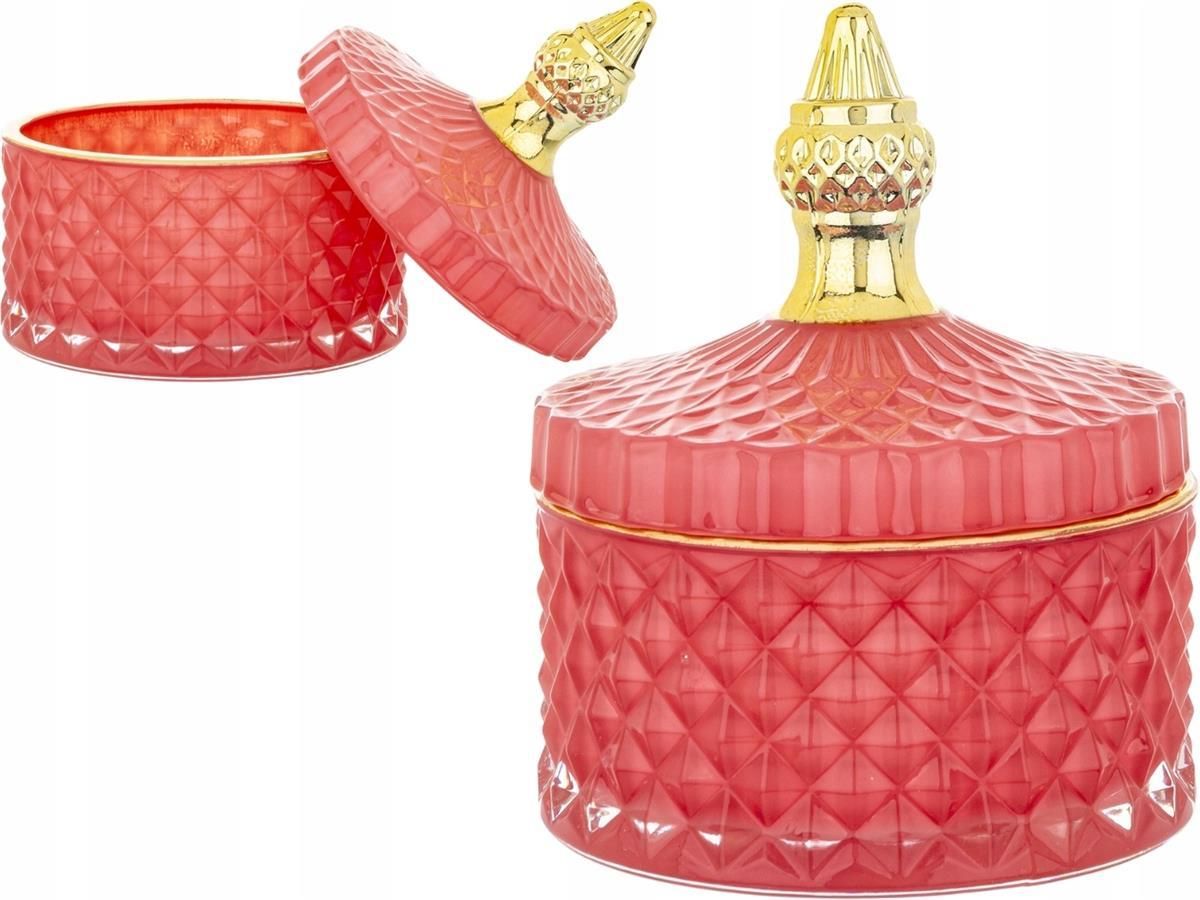 156338 Szklany pojemnik - 13,5x10,5 cm Od FotoABC - autoryzowanego dystrybutora Cechy Praktyczny pojemnik z pokrywką - do przechowywania wacików, płatków kosmetycznych itp. Może mieć również wiele innych zastosowań i doskonale będzie się komponować w każdym wnętrzu Wykonany z grubego, tłoczonego szkła, barwionego na czerwony kolor, ze złotym uchwytem (rzeczywisty odcień kolorów może się różnić ze względu na indywidualne ustawienia monitora) Ozdobiony jest geometrycznym wzorem, który pięknie załamuje światło Pojemnik wykonany bardzo starannie i estetycznie Charakterystyka materiał: szkło kolor: czerwony, złoty wysokość: 13,5 cm średnica: 10,5 cm waga: ok. 0,63 kg Doskonały pomysł na elegancki prezent.