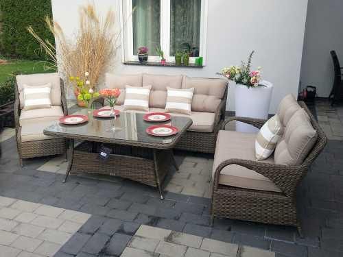 Meble ogrodowe z technorattanu NEPTUN marki Bel Giardino to praktyczny zestaw łączący funkcje jadalnianą i wypoczynkową, który charakteryzuje się nowoczesnym wyglądem. Komplet wykonany jest z półokrągłego technorattanu, który doskonale imituje naturalny rattan, ale wyróżnia się dużą odpornością na warunki atmosferyczne. Zestaw świetnie sprawdzi się jako zestaw tarasowy lub balkonowy. Cechy produktu: stół prostokątny, o długości 138cm i szerokości 88cm, z blatem z hartowanego szkła; fotel z poduszkami, na siedzisko i oparcie, w kolorze BEŻOWY SZARY i o grubości 10cm; podnóżek z poduszką w kolorze BEŻOWY SZARY i o grubości 5cm; sofa z poduszkami, na siedzisko i oparcie, w kolorze BEŻOWY SZARY i o grubości 10cm; kanapa z poduszkami, na siedzisko i oparcie, w kolorze BEŻOWY SZARY i o grubości 10cm; rattan syntetyczny, półokrągły, w kolorze BRĄZOWY MAT; konstrukcja aluminiowa. Komplet wykonany został z półokrągłej plecionki, która łączy się aluminiowymi podstawami. Cechami charakterystycznymi zestawu są proste kształty, niskie oparcia z wystającymi poza krawędź elementów poduchami oraz głębokie siedziska. Świetnie łączy ze sobą funkcje jadalnianą oraz wypoczynkową, dzięki czemu znajduje uznanie w oczach ludzi ceniących sobie uniwersalność oraz wygodę. Zaokrąglenia i opływowe kształty elementów, a także duża liczba poduch, nadaje tym meblom rattanowym modernistyczny styl i charakter. Meble ogrodowe marki Bel Giardino są wykonane z rattanu najwyższej jakości, który cechuje się wyjątkową lekkością oraz wytrzymałością na warunki atmosferyczne, takie jak deszcz i śnieg. Dzięki zastosowaniu nowego syntetycznego materiału uzyskano doskonałą jakość oraz wytrzymałość. Rattan, z którego wykonane są nasze meble, jest doskonałą imitacją naturalnego materiału. Aluminiowa podstawa stołu wymaga prostego montażu. Elementy montażowe znajdują się w komplecie. Zalety kompletu: odporność na działanie promieni UV; odporność na warunki atmosferyczne; elegancka plecionka; niepowtarzalne wzornictwo; wzmocniona konstrukcja stelaża; rama aluminiowa, malowana proszkowo; dodatkowe wzmocnienia zapewniają długotrwałą wygodę i komfort użytkowania mebli ogrodowych.