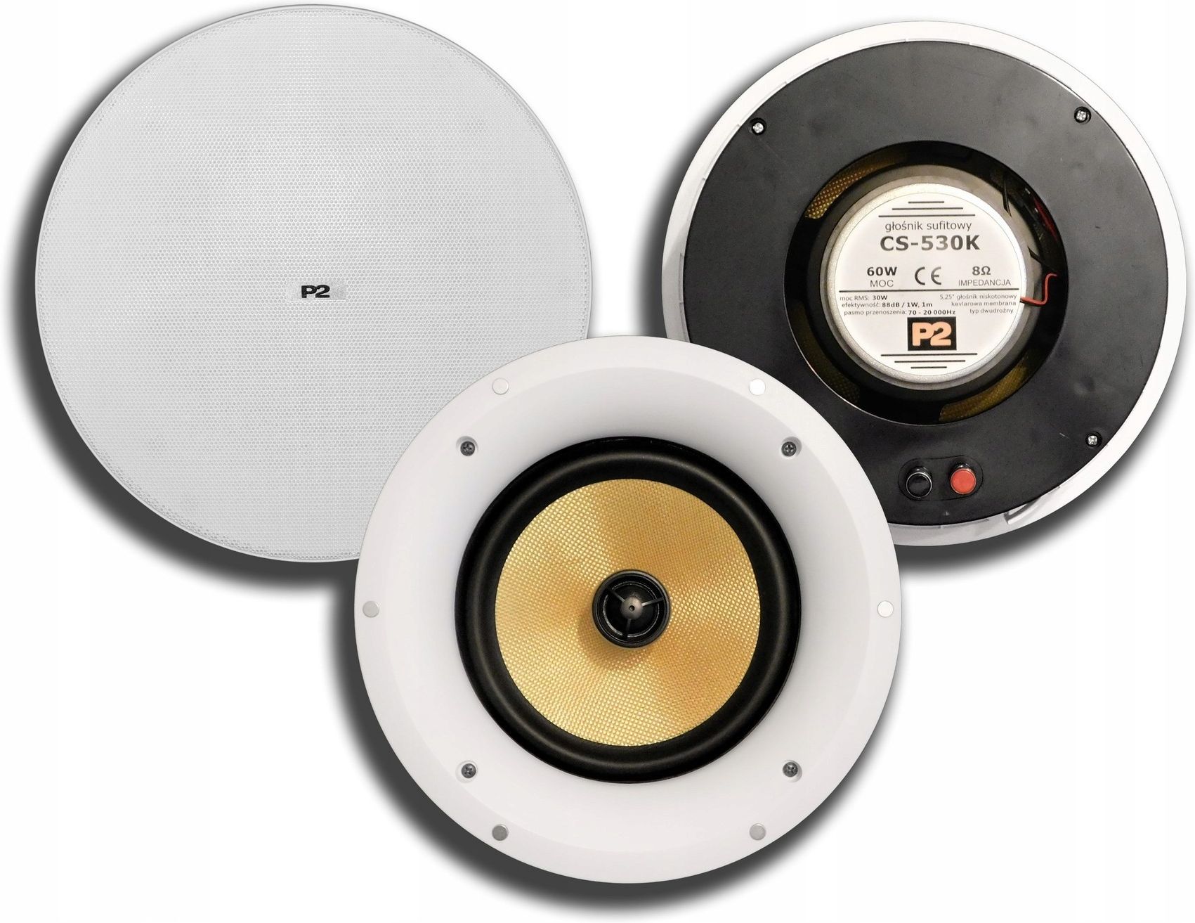 P2 CS-530K Głośnik sufitowy dwudrożny Wariant kolorystyczny: biały Głośniki linii CS-XXXK to efektowne modele dwudrożne z okrągłą maskownicą mocowaną na magnesy. Kevlarowa membrana głośnika niskotonowego oraz jedwabna membrana głośnika wysokotonowego gwarantują długą i niezawodną pracę oraz wysokiej jakości dźwięk. Ponadto, cechują się bardzo łatwą instalacją w sufitach podwieszanych dzięki specjalnym łapkom montażowym. Modele CS-XXXK dostępne są w trzech rozmiarach, dzięki czemu idealnie wpasują się do każdego pomieszczenia z sufitem podwieszanym, niezależnie od jego wielkości i w każdym zapewnią bardzo dobrą jakość dźwięku. Głośniki CS-XXXK szczególnie polecamy do nagłośnienia domu, biura, małego lokalu użytkowego, prywatnego gabinetu, butiku etc. Specyfikacja 5,25" głośnik niskotonowy z kevlarową membraną 1" głośnik wysokotonowy z jedwabną membraną moc RMS 30 W / 8 Ω efektywność 88 dB / 1W, 1m pasmo przenoszenia 70 - 20 000 Hz w zestawie magnetyczna okrągła maskownica zalecany montaż w sufitach i ścianach z płyty gipsowo-kartonowej szybki montaż magnetycznych maskownic bez użycia śrub lub zatrzasków stopień ochrony IP 30 wymiary (średnica głośnika x głębokość montażowa) ⌀ 217×105 mm średnica otworu instalacyjnego ⌀ 180 mm kolor biały waga 1,3 kg