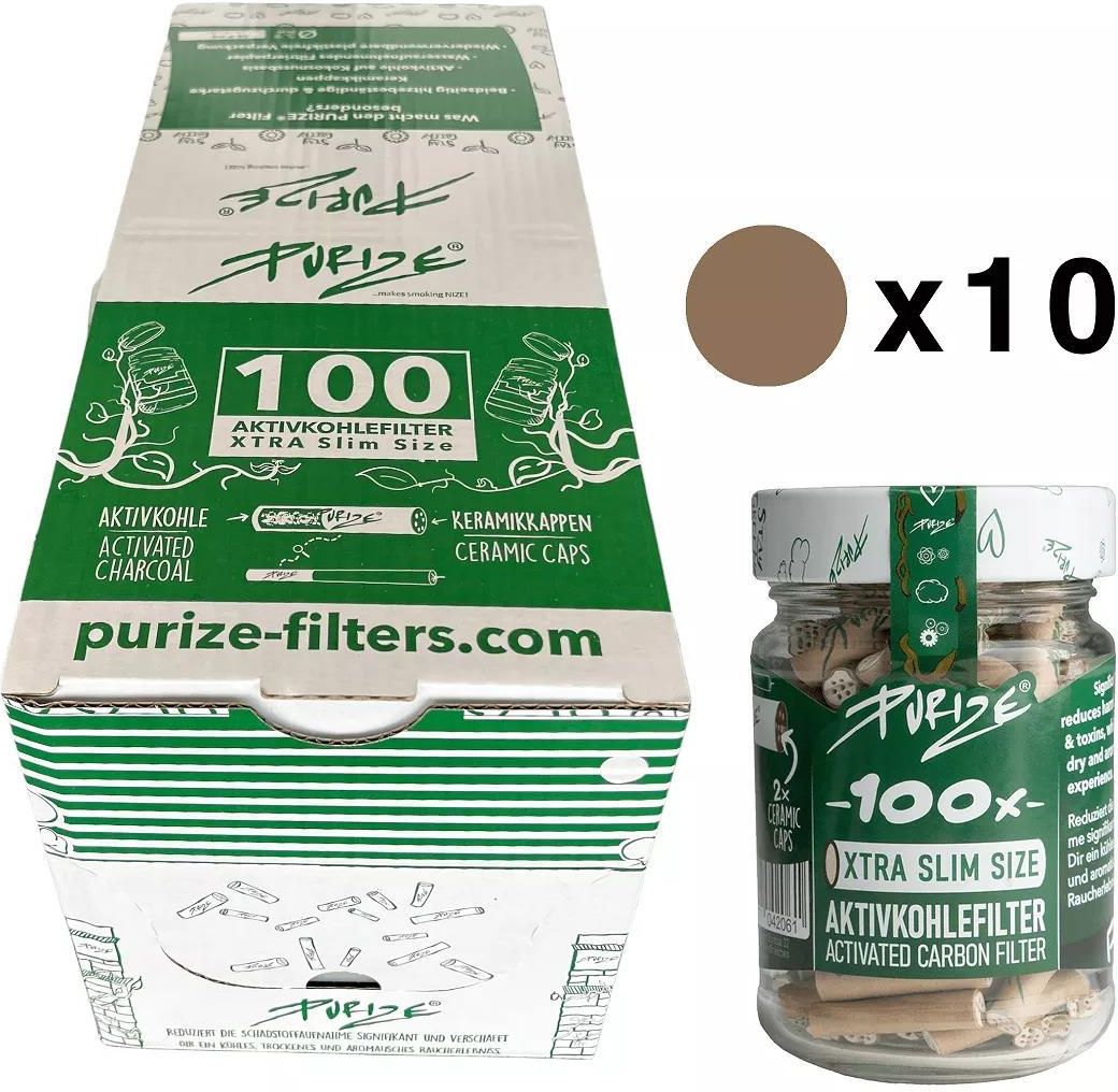 Filtry węglowe Purize XTRA Slim BOX 10 x 100 szt. ORGANIC Filterki do jointów z aktywnym węglem Purize XTRA Slim Organic. Box - Opakowanie zbiorcze 10 x szklany słoik 100 szt. Filtry Purize ograniczaja ilość substancji smolistych przedostających się do płuc i podkreślają smak suszu. Zaopatrzone są w oryginalne, ceramiczne zaślepki umieszczone z obu stron filtra.