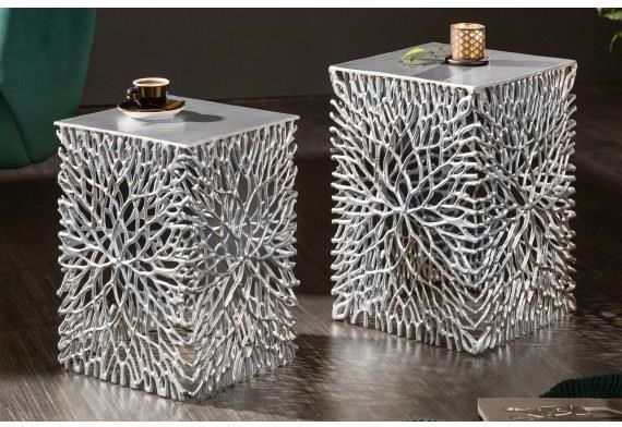 ZESTAW 2 STOLIKÓW KAWOWYCH LEAF SREBRNY Ten nowoczesny zestaw stolików kawowych koloru srebrnego wykonany został w całości ze stopu metalo-aluminiowego, który idealnie odnajdzie się w przestronnym nowoczesnym salonie. Wyjątkowość tego mebla stanowi jego kształt oraz wygląd odzwierciedlający pajęczynę, wzór ten wykonywany jest za pomocą frezowania ręcznego, dzięki czemu kusi swoją unikalnością oraz niepowtarzalnością. W górnej części stolików umiejscowiono kwadratowe blaty, a ich podstawę stanowi długa prostokątna zdobiona podstawa. Głównym atutem ich jest nietypowa forma oraz możliwość ustawienia ich ze sobą w dowolnie pasujący sposób jak również każdy z osobna. Efekt końcowy wykończenia całości w srebrnych kolorach jest jednolity sprawiając tym samym, że zestaw stolików kawowych LEAF to idealne rozwiązanie dla każdego salonu w stylu nowoczesnym, gdzie doda przestrzeni niesamowitej elegancji, a także zachwyci każdego swoją ciekawą formą. W serii LEAF występują również lampy, lustra oraz stoliki kawowe w różnych rozmiarach oraz kolorach - patrz produkty powiązane. Produkt jest wykonany z surowców naturalnych, przez co może różnić się od prezentowanych zdjęć. Wszystkie przetarcia, szczeliny oraz nierówności są zamierzone. Każdy produkt jest przez to unikalny i oryginalny. Invicta Interior to niezawodny dostawca ekskluzywnych designerskich mebli i akcesoriów domowych. Jest to dynamiczna i doświadczona firma z wieloletnimi międzynarodowymi kontaktami i stale poszukującą nowych produktów i innowacyjnych pomysłów. Dojrzała ogólna koncepcja firmy pozwala zaoferować klientom duży wybór nowoczesnych i klasycznych mebli o wyjątkowej jakości w rozsądnych cenach. Invicta Interior monitoruje wszystkie aktualne trendy w branży meblowej, dlatego klienci zawsze otrzymują najnowsze i najwyższej jakości designerskie meble.