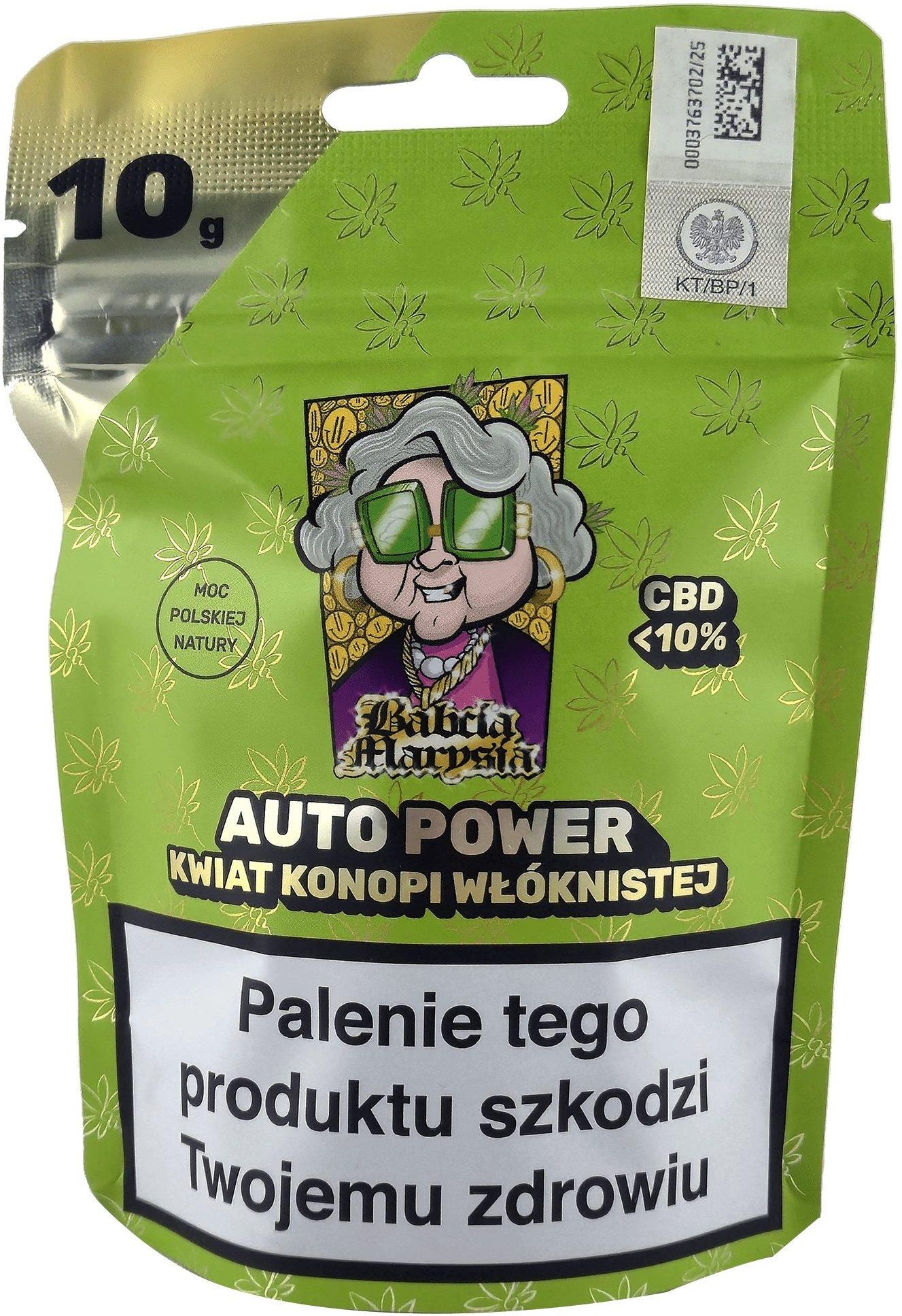 Susz CBD Babcia Marysia AUTO-POWER Susz konopny CBD Babcia Marysia w odmianie Auto-Power. Produkt przeznaczony do palenia – w 100% legalny, oznaczony znakami akcyzy. Chcesz poczuć prawdziwą moc natury? Auto-Power to najwyższej jakości susz CBD, który spełni oczekiwania najbardziej wymagających użytkowników. Duże, żywiczne pąki o intensywnym, drzewnym i cytrusowym aromacie dostarczą Ci niezapomnianych doznań. Dzięki stymulującemu efektowi pobudzisz swoje zmysły i umysł. Susz CBD Auto-Power to produkt w 100% naturalny, pochodzący z certyfikowanych polskich upraw. Cały proces produkcji: od ręcznego zbierania, przez sortowanie, aż po suszenie, odbywa się bez użycia sztucznych dodatków. Certyfikaty Global GAP, HACCP i GACP potwierdzają najwyższą jakość i bezpieczeństwo suszu. Całość poakowana jest w wygodne woreczki strunowe. Zawartość: - CBD: 10% - THC: mniej niż 0.3% Produkt nie wywołuje działań psychoaktywnych.