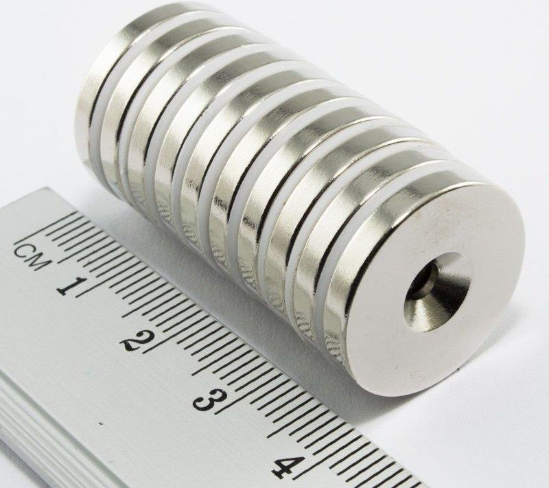 Magnes neodymowy MP20 7,5x3,5x5 N38 pod śrubęParametry magnesu: średnica zewnętrzna: 20 mm (±0,1 mm) średnica wewnętrzna: 3,5 mm (±0,1 mm) średnica fazy / kąt: 7,5 mm (±0,1 mm) / 90 wysokość: 5 mm (±0,1 mm) waga magnesu: ~12 g kierunek magnesowania: wzdłuż wymiaru 5 mm (wysokość) materiał magnetyczny N38 maksymalna temperatura pracy: 80C. powłoka: Ni+Cu+Ni (Nie należy stosować w wodzie) Udźwig maksymalny: ~6,91 kgWłasności magnetyczne materiału N38: indukcja remanencji Br 1,22 - 1,25 [T]; 12,2-12,5 [kGs] koercja HcB: 899 [kA/m]; 11,3[kOe] koercja HcJ: 955 [kA/m]; 12 [kOe] gęstość energii magnetycznej (BH)max.: 287-310 [kJ/m3]; 36-39 [MGOe]Uwaga: Ponieważ na Udźwig maksymalny magnesu ma wpływ wiele czynników, polecamy sprawdzenie magnesu w konkretnych warunkach.