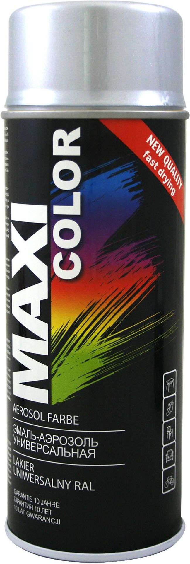 MAXI COLOR Lakier uniwersalny w sprayu Połysk, Pojemność: 400ml, RAL 9006- MX9006. MAXI COLOR Lakier spray - zalecenia: Przed malowaniem, powierzchnię dokładnie i równomiernie wyszlifować papierem ściernym (usnąć rdzę) bądź innymi materiałami matującymi. Następnie oczyścić powierzchnię z różnych zabrudzeń, osuszyć i odtłuścić specjalnym preparatem (zmywacz silikonowy, ewentualnie benzyna/rozpuszczalnik ekstrakcyjny). Na malowaną powierzchnię warto nanieść lakier podkładowy odpowiedni na daną powierzchnię (np. podkład do plastiku, aluminium na "surowy" metal). Lakier uniwersalny RAL - zastosowanie: Przed użyciem produkt dokładnie wymieszać (ok. 2 minuty) i upewnić się, że spray ma temperaturę pokojową. Dokonać natrysku próbnego. UWAGA! Bez wykonania natrysku próbnego reklamacji nie uwzględnia się. Zachować odpowiednią odległość nanoszenia farby od malowanej powierzchni (ok. 25-30 cm). Malować kilka równomiernych i cienkich warstw w odstępie kilku minut. Zalecana temperatura otoczenia pracy to ok. 20-25 stopni. Czas utwardzenia ok. 2 godziny. Po zakończeniu pracy, w celu oczyszczenia dyszy, odwrócić puszkę "do góry nogami", nacisnąć przez chwilę dyszę rozpylając pozostałości lakieru znajdującego się w zaworze. Towar na magazynie. Oryginalny produkt marki Motip.
