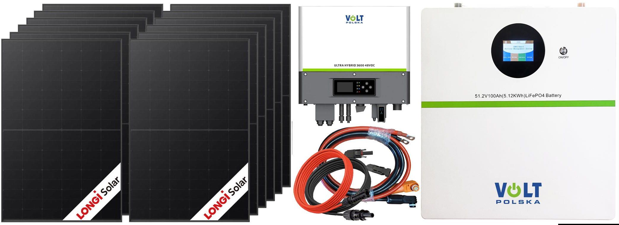 Off-gridowy zestaw solarny 3600W: 12 x panel 435W + magazyny energii 100Ah + przewody do połączenia + inwerter hybrydowy ULTRA HYBRID 3600 48/230V (36 Knurów