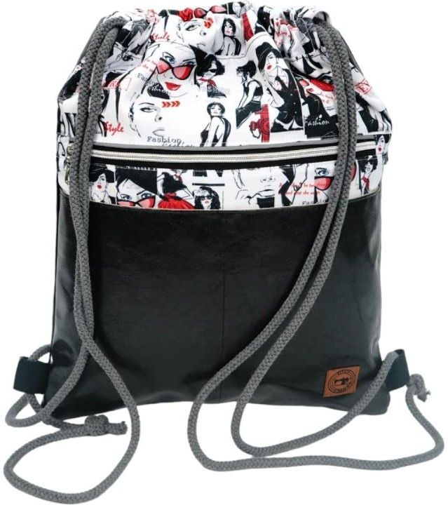 Czarny Worko-Plecak z Motywem Fashion – Handmade z Ukrytą Kieszenią na Zamek Nowoczesny worko-plecak handmade, który łączy czarną ekoskórę z tkaniną poliestrową w modny motyw fashion. Stylowy nadruk inspirowany miejskim światem mody i elegancji nadaje mu wyjątkowego charakteru. To idealny model dla osób, które cenią oryginalne dodatki z nutą stylu „fashion street”. Plecak posiada komorę główną zamykaną na sznurek troczek, dzięki czemu jest lekki i praktyczny. Z przodu znajduje się duża kieszeń przeszyta na pół, tworząca dwie osobne przegródki oraz dodatkowa kieszeń zamykana na zamek. Z boku umieszczono ukrytą kieszeń na zamek, idealną na telefon, klucze lub inne drobiazgi. Szare sznurki dopełniają nowoczesny wygląd plecaka, zapewniając jednocześnie wygodę noszenia. Model jest pojemny, solidny i idealny na co dzień. Świetnie sprawdzi się w pracy, na uczelni, spacerze czy zakupach. Łączy elegancję z funkcjonalnością – w duchu stylu handmade. Najważniejsze cechy produktu Materiał: ekoskóra + tkanina poliestrowa Zamknięcie główne: sznurek troczek Kieszenie: przednia podwójna (przeszyta), przednia na zamek, boczna ukryta na zamek Wymiary: 40 cm (wys.) × 32 cm (szer.) Kolor: czarny z motywem fashion Wzór: fashion, kobiecy, miejski Wykonanie: handmade – szyte w Polsce Przeznaczenie: do pracy, na spacer, wyjazd, zakupy Dla kogo? Worko-Plecak Czarny z Motywem Fashion to propozycja dla kobiet, które lubią stylowe i praktyczne dodatki. Świetnie sprawdzi się jako plecak miejski lub elegancki element casualowej stylizacji. Idealny na co dzień i w podróży.
