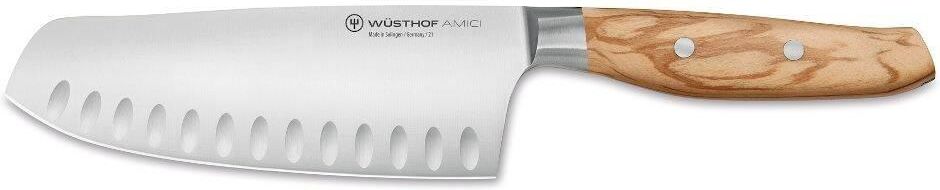 Nóż santoku marki Wusthof linii Amici o długości 17 cm. Posiada ostrze cieńsze od tradycyjnego noża szefa kuchni, dzięki wgłębieniom na ostrzu podczas krojenia tworzą się małe kieszonki powietrzne zapobiegające przywieraniu krojonych produktów do noża. Precyzyjnie wykute z jednego kawałka stali ostrze o twardości 58 w skali Rockwella. Laserowy proces ostrzenia sprawia, że nóż pozostanie ostry przez długi czas. Rękojeść wykonana jest z drewna oliwnego, które jest naturalnie wodoodporne i ma właściwości anty-bakteryjne. Nóż należy myć bezpośrednio po użyciu w ciepłej wodzie używając łagodnych środków myjących. Długość całkowita 29,7 cm.