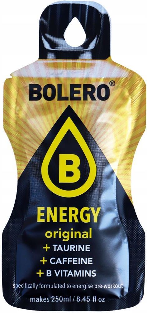 BOLERO 7g ENERGY ORIGINAL - PROSZEK DO PRZYGOTOWANIA NAPOJU ENERGETYCZNEGO ZE SŁODZIKAMI NIE ZAWIERA CUKRU WYSOKA ZAWARTOŚĆ KOFEINY (32MG/ 100ML) NIE ZALECA SIĘ SPOŻYWAĆ DZIECIOM, KOBIETOM W CIĄŻY I KARMIĄCYM PIERSIĄ ZAWARTOŚĆ ROZPUŚCIĆ W 250 ML - 500 ML WODY SKŁADNIKI KWASY: KWASEK CYTRYNOWY; …
