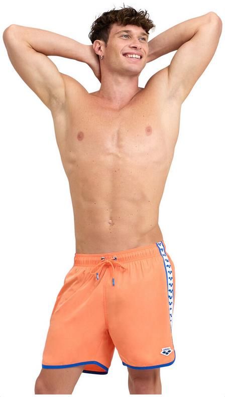 Spodenki Arena M ICONS TEAM STRIPE BOXER Arena Bokserki Icons Team Stripe, będące częścią naszej kolekcji dziedzictwa z nowoczesnymi wzorami w stylu vintage, mają paski z logo retro po bokach, kontrastowe lamówki i boczne otwory wentylacyjne. Wykończone oczkiem na tylnej kieszeni dla szybkiego odprowadzania wilgoci, ten styl wygląda równie dobrze na plaży, jak i w mieście. Materiał Ten pochodzący z odpowiedzialnych źródeł materiał strojów kąpielowych jest wykonany w 100% z poliestru pochodzącego z recyklingu. Ten szybkoschnący materiał jest idealny do pływania, surfowania i łapania promieni. Krój + dopasowanie Nasze bokserki kąpielowe mierzą 41,5 cm i sięgają tuż nad kolano. Są wyposażone w wewnętrzne majtki zapewniające dodatkowy komfort i regulowany sznurek. 100% poliester