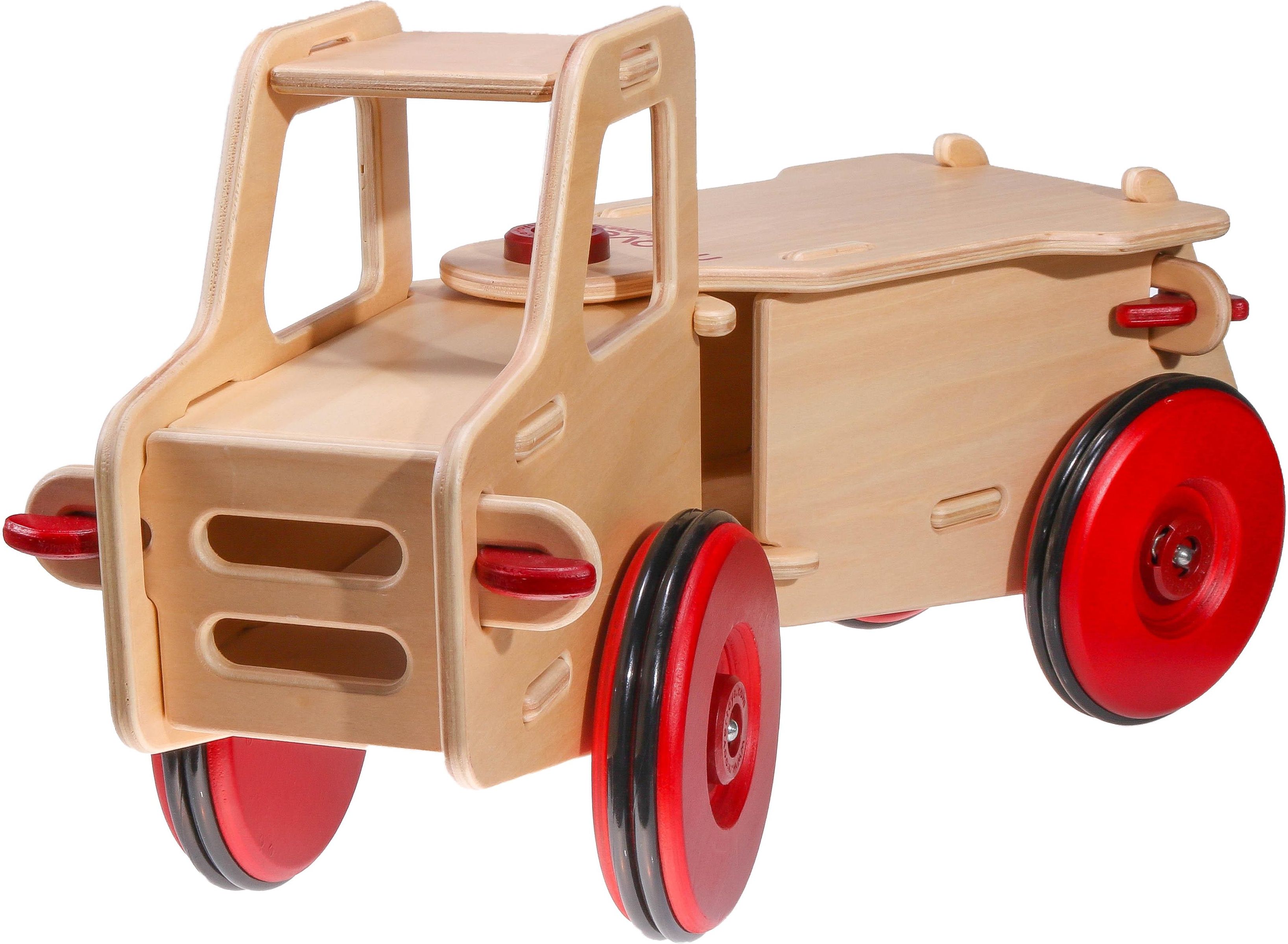Drewniany jeździk przedszkolaka w kolorze naturalnego drewna zaprojektowano w stylu retro. Przemyślany w najmniejszym szczególe idealnie sprawdzi się jako uzupełnienie wyposażenia w żłobku. Zabawka marki Moover pochodzi z kolekcji przeznaczonej dla dzieci od 2 do 6 lat. Tylko naturalne materiały Zabawka w całości wykonana jest z naturalnej okleiny z drewna lipowego o grubości 10 mm oraz podwójnych, drewnianych kół zakończonych gumową taśmą. Koła pokryte są ekologiczną farbą z atestem, dlatego rodzic nie musi martwić się o substancje uczulające. Podłoże antypoślizgowe Masz już dość głośnych zabawek? Zastosowane koła antypoślizgowe zmniejszają uciążliwy hałas. Dodatkowo rozwiązanie chroni podłogi naszego mieszkania oraz samą zabawkę przed zużyciem. Jak wiesz, każdy urwis porusza się we własnym tempie. Obicia kół obniżają maksymalną prędkość jeździka oraz pozwalają na jego indywidualne dostosowanie do użytkownika. Zabawka nie traci przy tym na łatwości prowadzenia. Solidne wykonanie Jeździk przedszkolaka jest w pełni stabilny i nie przechyla się. Zamontowane w samochodzie koła zabezpieczają dodatkowo stelaż przed przewróceniem. Dziecko może bez obaw wsiadać na niego i jeździć. Pojazd porusza się zarówno do przodu jak i do tyłu. Łatwo się nim skręca oraz obraca, dzięki specjalnemu mechanizmowi połączenia ciągnika z naczepą. Dziecko, które uczy się jeździć stara się utrzymać równowagę oraz stabilność. Jednak nie zawsze wszystkim wychodzi to od razu. Dlatego też wszystkie krawędzie ciężarówki zostały zaokrąglone, by zadbać o bezpieczeństwo malucha. Solidne wykonanie zwiększa wartość zabawki oraz buduje zaufanie dzieci i ich rodziców do marki. Gdy urwis wykorzystuje zabawkę jako jeździk, naczepa pełni funkcję siedzenia. Jeśli znudzi mu się jazda, może zacząć przewozić w schowku naczepy lalki, klocki lub inne swoje zabawki. Opracowany zgodnie z potrzebami dzieci Zabawkę stworzono na podstawie zachowań dzieci oraz ich potrzeb. Duńscy specjaliści przeprowadzili badania reakcji na zmysły dziecka. Skupili się na tym co przykuwa największą uwagę dzieci. Czym lubią się bawić. Jakiego koloru zabawka przyciąga wzrok. Z jakiego jest materiału, że sięgają po nią jako pierwszą. W czasie tworzenia zabawki producenci opierali się na zebranych informacjach. Detale zabawki zostały dopracowane w taki sposób, aby służyła niejeden raz. Korzyści z zabawy Zadbaj o prawidłowy rozwój swego dziecka. Maluch uczy się przez zabawę w przewóz lalek czy samochodzików. Zabawa pojazdami rozwija dziecięcą wyobraźnię oraz zachęca do odkrywania i ćwiczenia umiejętności motorycznych. Ciężarówka jeździk rozwija integrację sensoryczną oraz stymuluje zmysły dziecka. Zabawka zachęca również do podejmowania kolejnych aktywności ruchowych. Montaż zabawki Jeździk przedszkolaka jest dostarczany w całości, jako złożony i gotowy do użycia. Wystarczy nasunąć jedynie koła i można ruszać w drogę! Montaż zabawki z rodzicem to niezła frajda dla malucha. Zabawka sprawdzi się dla dzieci powyżej 2 roku życia. Trochę o samej marce Duńska firma Moover specjalizuje się w produkcji drewnianych zabawek. Zaprojektowane na podstawie zachowań dzieci, opracowane by rozwijały i uczyły. Producent posiada różnego rodzaju meble dla lalek, samochody dla chłopców czy układanki oraz zawieszki dla maluchów. Przemyślane w każdym szczególe, oryginalnie zaprojektowane oraz solidnie wykonane posłużą niejednemu pokoleniu. Przywołaj wspomnienia z dzieciństwa, oczaruj swoją pociechę zabawką sprzed lat i odkryj na nowo dziecięcy świat. Moover spełni Twoje oczekiwania.