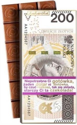 Czekolada Mleczna Kukartka 200 zł Prezent 100 g Czekolada Mleczna Kukartka 200 zł to niebanalny i smakowity prezent, który wyróżnia się opakowaniem stylizowanym na banknot o nominale 200 zł. To doskonały upominek, który łączy wysokiej jakości mleczną czekoladę z zabawną i oryginalną formą, idealny …