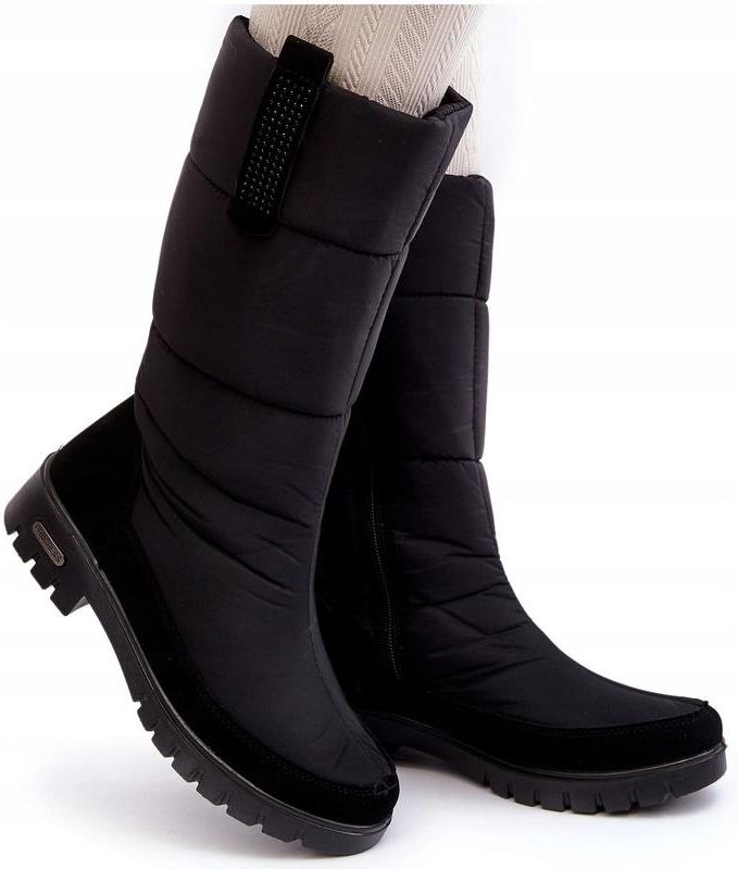 Damskie Ocieplane Śniegowce Progress PROGJ-22-136 Czarne - rozmiar 40 Kod towaru: 28295 Wysokie śniegowce damskie zostały wykonane z nieprzemakalnych materiałów. Osadzone na płaskim obcasie i platformie ze żłobieniami. Wewnątrz ocieplone kożuchem. Model zapinany na suwak. Na cholewce pasek …