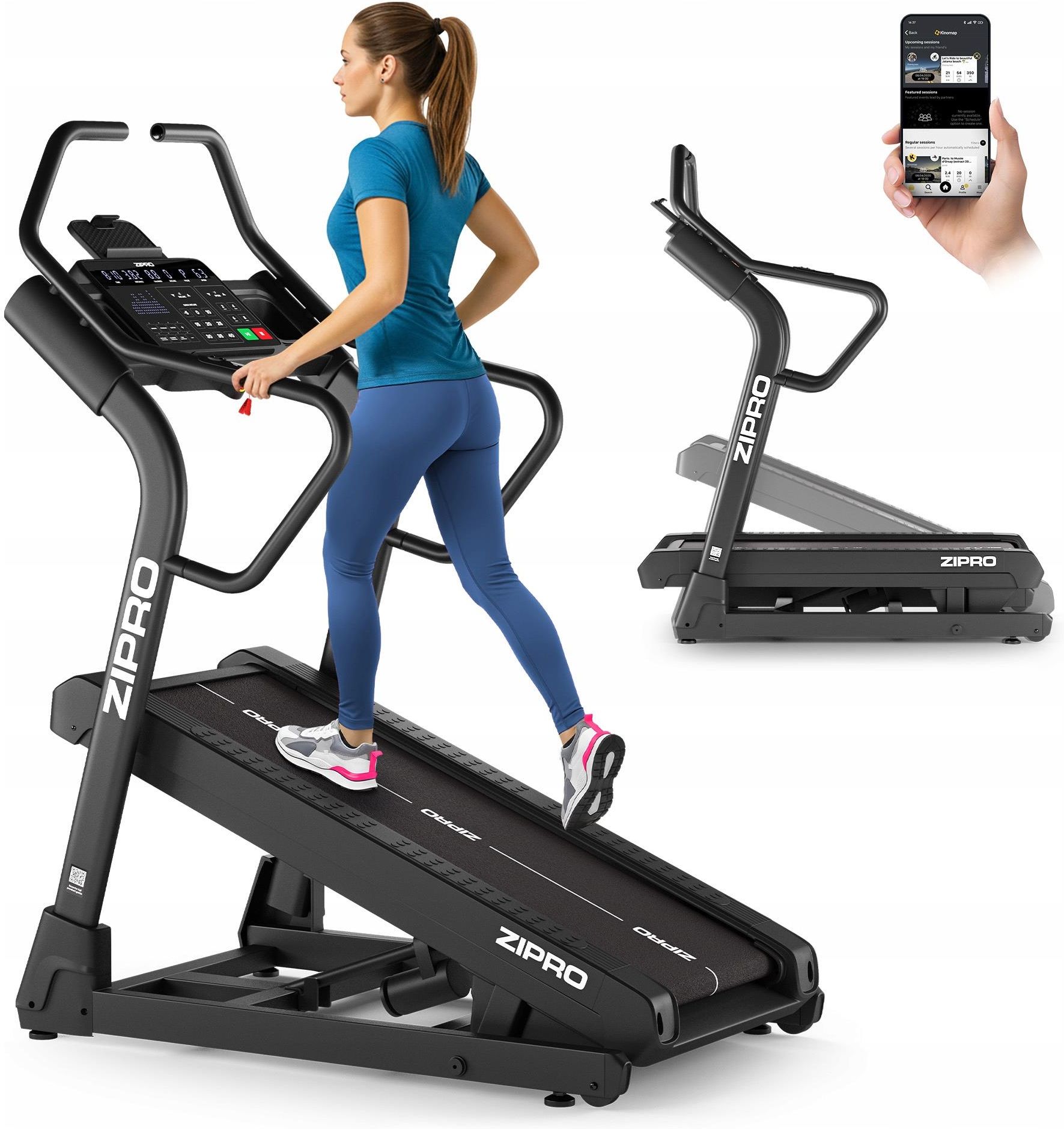 Bieżnia z dużym nachyleniem Zipro Shred Dane techniczne: Wymiary całkowite: 144 × 83 × 172,5 cm Pas biegowy: wymiary 120 × 46 cm Maksymalne uniesienie pasa: wymiary 68 cm Poziomy nachylenia: -5% - 40% Maksymalna prędkość: 16 km/h Silnik: elektryczny: 1,92-3 HP Amortyzacja: podkładki absorbujące wstrząsy, amortyzatory Maksymalna waga użytkownika: 135 kg Zasilanie: 220 V Waga bieżni: bez opakowania – 96 kg Specyfikacja komputera: Programy treningowe: 12 fabryczne, 3 użytkownika Funkcje dodatkowe: aplikacja FitShow, która umożliwia monitorowanie postępów i rywalizację z innymi użytkownikami oraz Kinomap, która robi terning interaktywnym, uchwyt na telefon/tablet, funkcje pomiaru pulsu i tkanki tłuszczowej, uchwyty na bidon, USB, Bluetooth Wybierz bieżnię dopasowaną do Twoich celów ZIPRO Shred sprawdzi się zarówno w intensywnym treningu cardio, jak i w przygotowaniu do wypraw górskich czy redukcji masy ciała. Zakres nachylenia od –5% do 40% pozwala odwzorować warunki trekkingowe, a maksymalna prędkość 16 km/h umożliwia także pełnowymiarowy bieg. Dzięki mniejszemu obciążeniu stawów niż podczas biegania na twardym podłożu urządzenie świetnie nadaje się również do interwałów i HIIT. Dotąd tego typu sprzęt dostępny był wyłącznie na siłowniach – teraz możesz korzystać z jego możliwości we własnym domu. Trenuj dokładnie tak, jak wymaga tego Twój cel Dzięki regulowanemu nachyleniu możesz ćwiczyć w różnych warunkach ruchowych – od stromych podejść (15–40%), przez zbiegi (–3% do –6%), aż po marsz i bieg po płaskim. To pozwoli Ci pracować nad kondycją oraz wzmacniać określone grupy mięśni: pośladki, uda, łydki czy core. Wysokie nachylenie wspiera budowę siły i sylwetki przy niższym obciążeniu stawów, zbiegi poprawiają kontrolę i amortyzację, a trening po płaskim sprawdza się w budowaniu rytmu, regeneracji lub pracy tlenowej. Wykorzystaj pełen zakres możliwości bieżni Silnik o mocy 1.92 HP pracuje stabilnie nawet przy dużym obciążeniu i intensywnych zmianach ustawień. Niezależnie od tempa czy kąta nachylenia, urządzenie utrzymuje płynność ruchu i reaguje bez opóźnień. Bieżnia osiąga do 16 km/h, a system sam dba o Twoje bezpieczeństwo, ograniczając prędkość przy stromym nachyleniu. Z kolei stabilna konstrukcja zapewnia komfort i pewność ruchu – urządzenie bez problemu obsługuje użytkowników do 135 kg. Trenuj pod górę, w dół lub na płaskim – jak w naturalnym terenie Zakres nachylenia od –5% do 40% pozwala realistycznie odwzorować podejścia i zbiegi, dlatego bieżnia Shred jest idealnym sprzętem do treningu trekkingowego, przygotowania górskiego, interwałów HIIT oraz redukcji tkanki tłuszczowej. Prędkość do 16 km/h umożliwia również intensywny bieg z mniejszym obciążeniem stawów niż na zewnątrz. Poruszaj się pewnie na każdym nachyleniu Pas biegowy o wymiarach 46 x 120 cm dostosowano do różnych form aktywności – zapewnia komfortową przestrzeń zarówno przy stromych podejściach, jak i podczas szybkiego biegu. Antypoślizgowa powierzchnia zapewnia stabilność nawet przy dużym nachyleniu, a system amortyzacji zmniejsza nacisk na stawy, co przekłada się na większy komfort i bezpieczeństwo podczas dłuższych treningów. Ergonomia i bezpieczeństwo w bieżni ZIPRO Shred wygodne poręcze ułatwiające utrzymanie stabilnej pozycji, solidna, stabilna rama zapewniająca pewność ruchu, amortyzowany deck redukujący obciążenie stawów, boczne pasy do bezpiecznego wchodzenia i schodzenia z pasa. Wspinaj się i wzmacniaj nogi Duże nachylenie aktywuje pośladki, dwugłowe uda i łydki. To skuteczny sposób na budowę siły, poprawę stabilizacji i kształtowanie dolnej partii ciała. Trening przy ujemnym nachyleniu wzmacnia czworogłowe uda, uczy kontroli i zwiększa odporność mięśni na przeciążenia. Spacer po płaskim torze poprawia krążenie i tlenową wytrzymałość. Wzmacnia także nogi i pomaga utrzymać aktywność w dni o niższej intensywności. Trening bez nachylenia aktywuje główne grupy mięśniowe i rozwija kondycję. Sprawdza się w pracy nad rytmem, koordynacją i ogólną wydolnością. Korzystaj z aplikacji i śledź swoje postępy Shred współpracuje z aplikacjami FitShow i Kinomap, które otwierają przed Tobą więcej możliwości – od gotowych tras i treningów, przez wyzwania i wydarzenia online, po rywalizację z innymi użytkownikami. Możesz dołączyć do społeczności, która motywuje do działania, a co najważniejsze – na bieżąco śledzić swoje postępy dzięki szczegółowym statystykom i historii treningów. Trenuj wygodnie i korzystaj z multimediów Wbudowane głośniki z funkcją Bluetooth pozwalają połączyć bieżnię z telefonem i słuchać muzyki, która nada rytm Twojemu treningowi. Tuż obok znajduje się duży uchwyt na tablet – idealny, jeśli korzystasz z aplikacji treningowych lub chcesz obejrzeć film w trakcie ćwiczeń. Dodatkowy port USB sprawia, że możesz ładować urządzenie bez przerywania sesji. Korzystaj z czytelnych danych i intuicyjnych ustawień Wbudowany komputer to Twoje centrum dowodzenia – na 7 dużych ekranach LED widzisz wszystkie dane treningowe jednocześnie, bez przełączania widoków. Masz stały podgląd m.in. na prędkość, czas, dystans, nachylenie i tętno. Dzięki przyciskom szybkiego wyboru możesz wygodnie zmieniać ustawienia – wybierasz konkretne programy, prędkości i kąty nachylenia bez przerywania ćwiczeń. Parametry i funkcje mierzone dane: czas, prędkość, dystans, kalorie pomiar tętna z uchwytów na poręczach – pozwala kontrolować intensywność i trenować w strefach pulsu funkcja odliczania według: czasu, prędkości lub spalonych kalorii 12 programów treningowych z automatyczną zmianą prędkości i nachylenia 3 programy do samodzielnej konfiguracji – dopasuj parametry do własnych potrzeb przyciski szybkieg