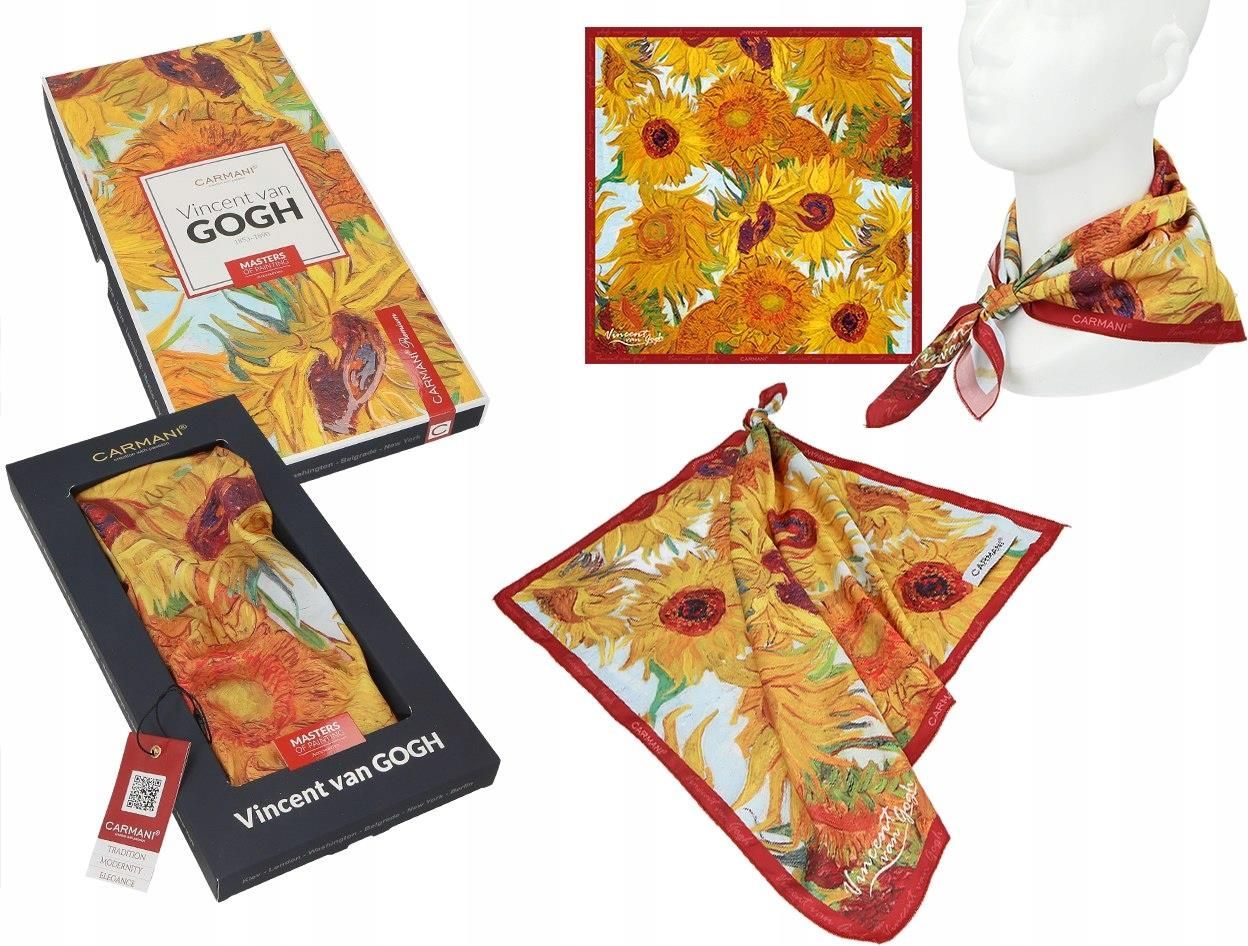 Apaszka - V. van Gogh, Słoneczniki (CARMANI) 023-3020 Apaszki CARMANI wykonane są z innowacyjnej tkaniny tamina szlachetna, która pozwala na wykonanie misternych wzorów przy zachowaniu jedwabistego dotyku. Informacje o produkcie Rozmiar: 50x50cm Rodzaj opakowania: kolorowy kartonik
