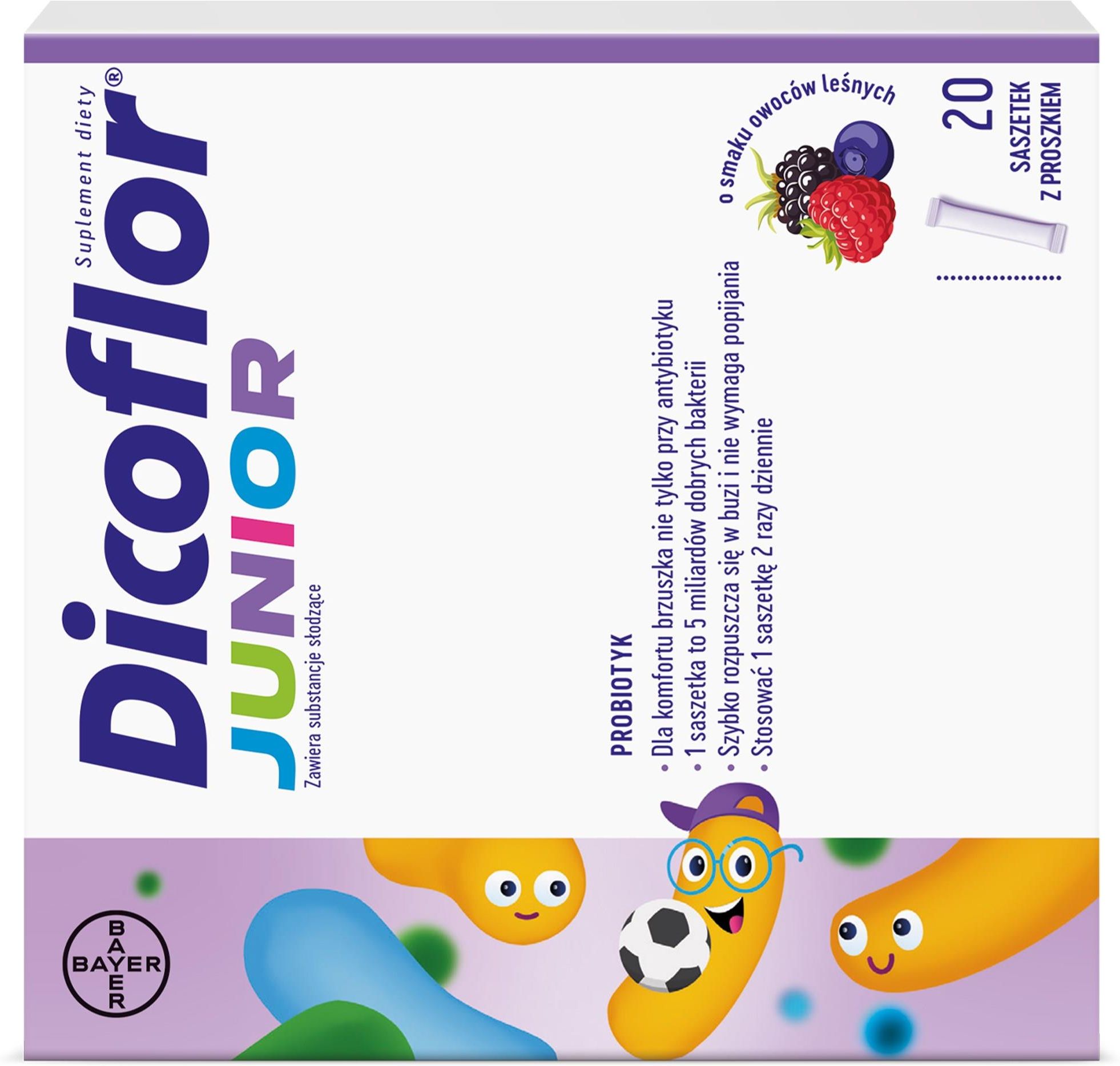 Dicoflor Junior, dla dzieci od 3 lat i dorosłych, smak owoców leśnych, 20 saszetek Dicoflor® Junior w saszetkach to suplement diety w postaci proszku dla dzieci od 3 roku życia i dorosłych. Preparat ma przyjemny smak owoców leśnych. Dzięki zastosowaniu innowacyjnej technologii szybko rozpuszcza się w buzi, w związku z czym nie wymaga popijania i można go dozować wprost na język. Poznaj Dicoflor® Junior w saszetkach Zawiera 5 miliardów żywych kultur bakterii Lactobacillus rhamnosus GG (ATCC 53103) w jednej saszetce. Bez glutenu i laktozy – odpowiedni także dla dzieci z nietolerancjami. Może być stosowany przez dzieci i dorosłych. Smak owoców leśnych. Praktyczna forma saszetek – łatwa do podania bezpośrednio do buzi. Nie wymaga przechowywania w lodówce. Zastosowanie Suplementacja diety w żywe kultury bakterii Lactobacillus rhamnosus GG. Dla dzieci powyżej 3 roku życia i dorosłych. Zalecane spożycie Dzieci od 3 roku życia i dorośli: 1-2 saszetki dziennie. Zawartość saszetki należy wysypać bezpośrednio na język. Produkt zaleca się stosować w trakcie posiłków. Składniki Dicoflor® Junior w saszetkach – skład Substancje słodzące: sorbitol, ksylitol; Lactobacillus rhamnosus GG; substancje przeciwzbrylające: tlenek magnezu, dwutlenek krzemu; regulator kwasowości: kwas cytrynowy; maltodekstryna; stabilizator: guma arabska; aromat. 1 saszetka zawiera: Lactobacillus rhamnosus GG 5 x 109 CFU*. 2 saszetki zawierają: Lactobacillus rhamnosus GG 10 x 109 CFU*. *CFU - jednostka tworząca kolonie (ang. Colony-forming Unit)