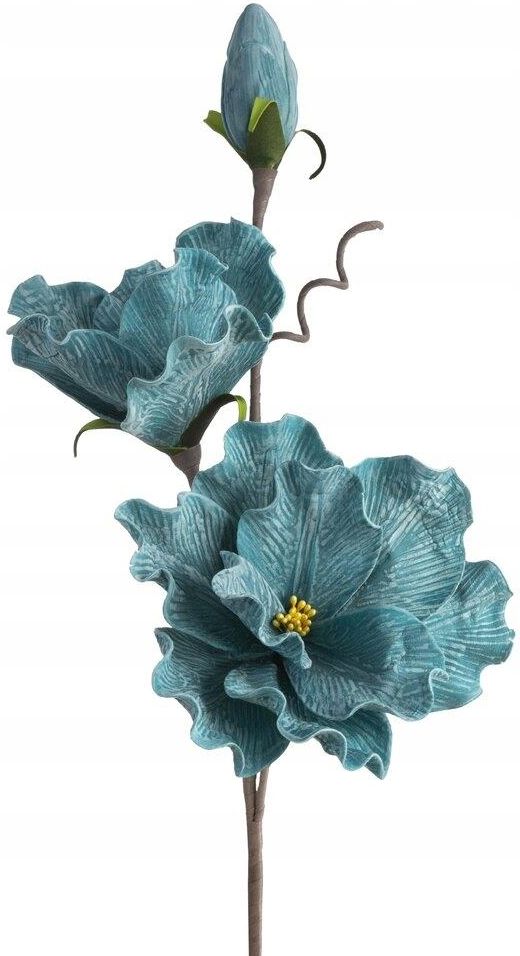 Kwiat sztuczny dekoracyjny turkusowy 76 cm Eurofirany Cena dotyczy jednej sztuki Lubisz kwiatowe kompozycje i bukiety? To świetnie, bo teraz mogą Cię one cieszyć o każdej porze roku. Sztuczny kwiat dekoracyjny na gałązce wykonany z niezwykłą dbałością o detale, zachwyca naturalnym pięknem. Gałązka z kwiatami jest idealnym dodatkiem do bukietów, dekoracji i różnego typu kompozycji kwiatowych. Kwiaty wykonane są z plastycznej pianki foamiran, dzięki czemu można je z łatwością ułożyć, natomiast łodyga z tworzywa sztucznego, ze specjalnym drucikiem w środku, pozwala na modelowanie łodygi. Ogromną zaletą kwiatów syntetycznych jest fakt, że zawsze wyglądają świeżo i nie wymagają specjalnej pielęgnacji, wystarczy przetarcie wilgotną ściereczką. Syntetyczne kwiaty idealnie nadają się do wystroju wnętrz, wnoszą do wnętrza świeżość i cieszą oko niezależnie od pory roku. Dane techniczne wysokość całkowita: 76 cm średnica kwiatu: 24 cm skład: 90% EVA (pianka foamiran), 10% metal