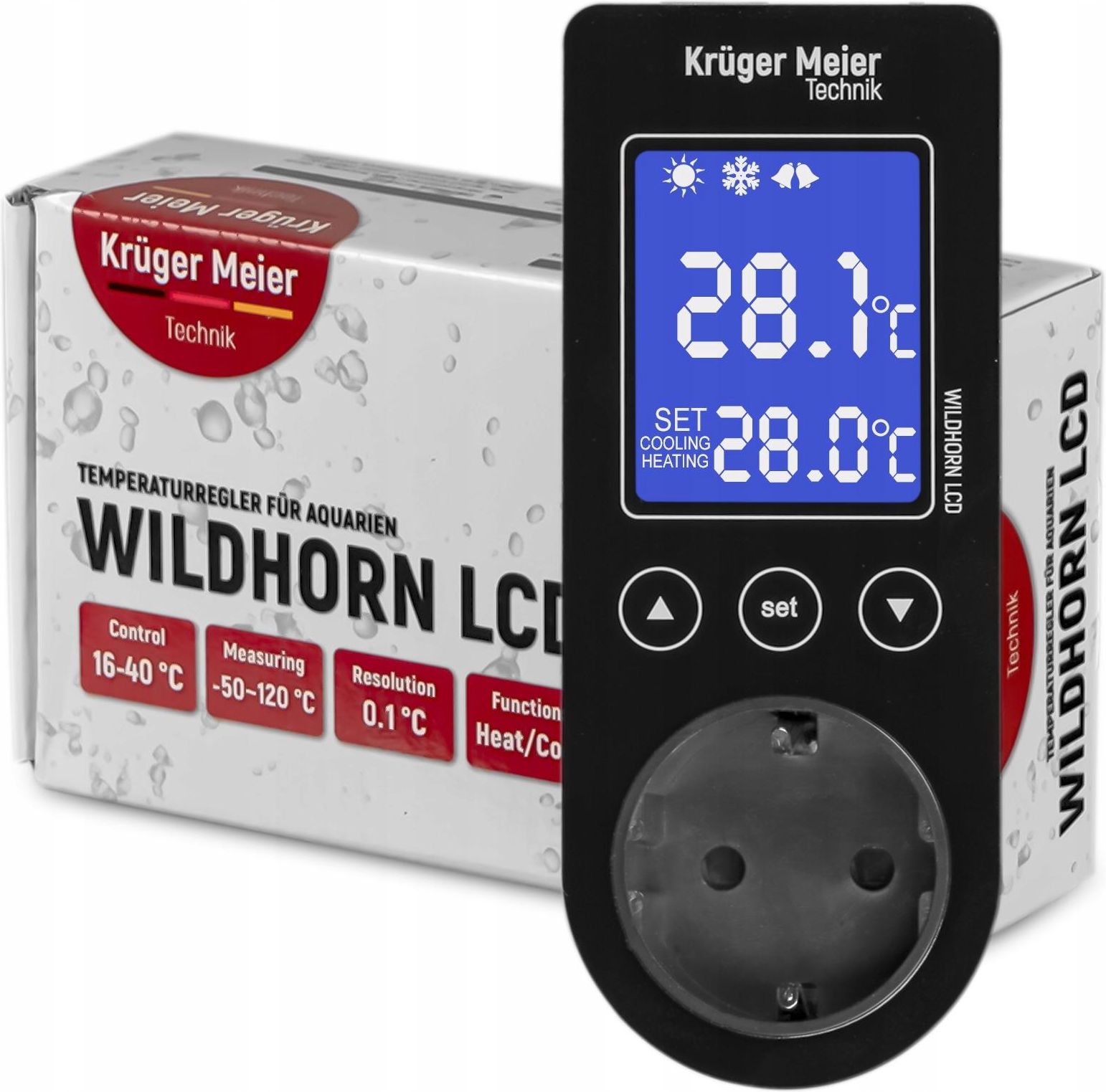 Termostat elektroniczny - akwarystyczny lub do terrarium. Cechuje go niezawodność, niezwykła precyzja oraz duży wyświetlacz LCD. Nadaje się do grzałki akwariowej, wentylatorów chłodzących, kabla grzewczego, maty grzewczej lub żarówek grzewczych. Posiada funkcje grzania, chłodzenia, opóźnienia, histerezy i alarm. przyciski dotykowe precyzyjna regulacja grzanie i chłodzenie funkcja opóźniania i histerezy alarm wodoodporna sonda temperatury Akwarystyczny - nie przemysłowy To jest cecha termostatu, którą powinieneś brać pod uwagę. Na czym polega różnica? Termostaty przemysłowe mają o wiele większy zakres pracy (np: od -40 do +110st.C) dla przemysłu taka rozbieżność jest ważna, ale do terrarium zupełnie niepotrzebna. Termostaty o tak szerokim zakresie pracy są o wiele mniej dokładne!!! Termostat Wildhorn posiada zakres pracy od +16 do +40st.C. Przy tak wąskim zakresie pracy (a jednocześnie wystarczającym dla każdego akwarium) termostat zachowuje mega dokładność przy każdym jednym stopniu temperatury, co jest kolosalnie ważne dla Twoich ryb i koralowców lub roślin. Grzanie czy chłodzenie? Termostat może odwrócić swoje działanie. Dlatego może sterować chłodzeniem (np: wentylator) lub ogrzewaniem (żarówka, kabel, itp) w zależności czego akurat potrzebujesz. Opcję chłodzenia na pewno docenią posiadacze Aksolotli. Szybkie programowanie i wyświetlacz LCD Programowanie jest skrajnie proste i poradzi sobie z nim każdy, nawet jeśli wcześniej nie korzystał z takich urządzeń. Podczas programowania wyświetlacz będzie Ci pokazywać temperaturę jaką sam ustalasz. Po programowaniu przełączy wyświetlacz na czuwanie, wyświetlając Ci aktualną temperaturę w terrarium. Szybkie programowanie i wyświetlacz LCD Programowanie jest skrajnie proste i poradzi sobie z nim każdy, nawet jeśli wcześniej nie korzystał z takich urządzeń. Podczas programowania wyświetlacz będzie Ci pokazywać temperaturę jaką sam ustalasz. Po programowaniu przełączy wyświetlacz na czuwanie, wyświetlając Ci aktualną temperaturę w terrarium. Funkcja grzania i chłodzenia Możesz dowolnie wybrać formę pracy termostatu. Może on sterować temperatura poprzez jej podnoszenie lub obniżanie, co jest ważne w czasie letnich upałów. Opóźnienie i histereza To przydatne funkcje. Opóźnienie włączenia urządzeń i histereza mają za zadanie imitować naturalne spadki temperatur i ich płynne przejścia. Sam wybierasz wartość histerezy i czas opóźnienia. Co mogę podpiąć pod termostat grzałki akwariowe chłodziarki wentylatory W terrarium - żarówki, emitery ciepła, promienniki, kable grzewcze, maty grzewcze, kamienie grzewcze Łącznie ich moc (bo możesz podpiąć kilka takich urządzeń na raz - korzystając z rozdzielacza lub listwy) nie może przekroczyć 1100W. To na tyle dużo, że na pewno nie zbliżysz się do tej wartości. Dane techniczne maksymalna moc grzałek, żarówek, kabli, mat grzewczych itp: 1100W maksymalna moc wentylatorów i pomp wody: 275W pobór prądu przez samo urządzenie - termostat: 3W - zakres pracy: 16 - 40st.C dokładność pracy 1st.C dokładność pomiaru: 0,1st.C długość kabla zasilającego: 100cm - długość kabla sondy: 150cm