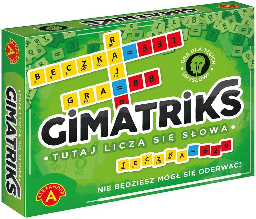 Gimatriks Gimatriks to propozycja, która idealnie trafi w gust graczy, którzy pokochali gry słowne i poszukują nowych wyzwań. Tym razem nagradzane nie jest tylko tworzenie jak najdłuższych słów, ale połączenie tej umiejętności z wzorowym liczeniem. Każdy z uczestników losuje kostki z literami, a także z cyframi. Ich zadaniem jest stworzenie słowa, którego wartość będzie się równać liczbie, którą stworzą ze zbioru wylosowanych kostek. Spore utrudnienie sprawia, że rywalizację wygrają tylko naprawdę tęgie głowy. Zabawa jest przeznaczona dla osób w wieku 12+ i sprawdza się znakomicie zarówno w wariancie indywidualnym, jak i w formie rywalizacji nawet 6 osób. Dla doświadczonych graczy dodano klepsydrę, która dynamizuje rozgrywkę i sprawia, że poziom trudności jeszcze wzrasta. „Gimatriks” wprowadza powiew świeżości na rynku gier słownych. Zawartość opakowania kostki z literami – 144 szt., kostki z cyframi – 72 szt., kostki „znak równości” – 36 szt., Woreczek na literki – 1 szt., woreczek na cyferki – 1 szt., klepsydra – 1 szt., notes – 1 szt., instrukcja. Skrócone zasady gry: WYLOSUJ 16 KOSTEK Z LITERAMI. 9 KOSTEK Z CYFRAMI I DOBIERZ 1 ZNAK RÓWNOŚCI Z PULI UŁÓŻ WŁAŚCIWE RÓWNANIE W SWOJEJ KOLEJCE, NIM UPŁYNIE CZAS DOBIERZ BRAKUJĄCE KOSTKI, BY ZAWSZE MIEĆ 16 LITER, 9 CYFR I ZNAK RÓWNOŚCI ZAPISZ PUNKTACJĘ W NOTESIE