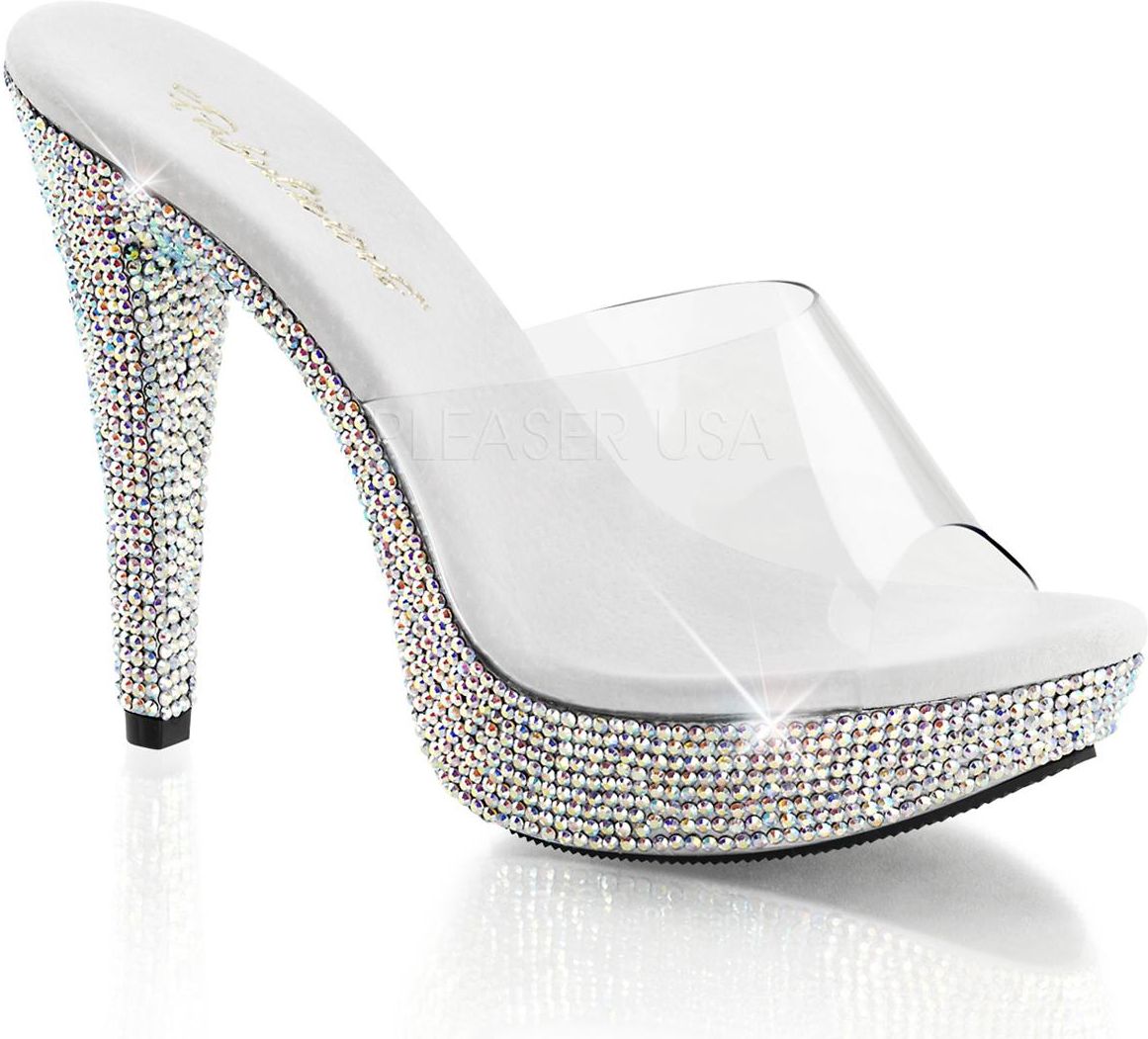 Oryginalne klapki na obcasie Fabulicious Cocktail-501DM Proste i lekkie, a zarazem przyciągające oko, seksowne i kobiece - tak w dużym skrócie opisać można model Cocktail-501DM, czyli obcasy marki Fabulicious, które znajdują się w szerokim asortymencie sklepu Bootky. Model ten jest jednak na tyle wyjątkowy, że nie warto ograniczać się zaledwie do kilku słów jego opisu. Poznaj je więc bliżej i dowiedz się, dlaczego warto zabrać je ze sobą do domu! Poznaj klapki na obcasie Cocktail-501DM Buty złożone są z zaledwie kilku prostych, lecz doskonale dopełniających się elementów. Każdy z nich wykonany został z doskonałej klasy materiałów, co gwarantuje nie tylko atrakcyjny wygląd modelu, ale również jego imponującą trwałość. Cholewka modelu to zaledwie jeden, szeroki pas ulokowany na wysokości palców. Wykonany z miękkiego, przezroczystego silikonu dodaje butom, jak i Twoim stopom wyjątkowej lekkości i zwiewności. Na uwagę zasługuje również dolna część modelu, czyli jego niemal 13-centymetrowy obcas oraz niewielki platforma o wysokości 2,5 centymetra. Oba te elementy w całości pokryte zostały malutkimi, mieniącymi się w świetle diamencikami, dzięki którym klapki Cocktail-501DM są jeszcze bardziej oryginalne!