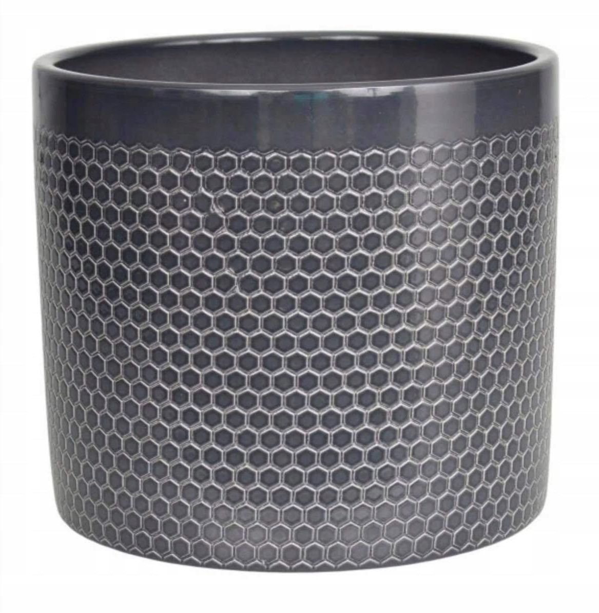 Osłonka ceramiczna grafitowa 15cm Osłonka ceramiczna w kolorze grafitowym, ze względu na swój uniwersalny wygląd, będzie pasować do każdego typu pomieszczeń. Posłuży jako doniczka na kwiaty żywe jak i sztuczne. Idealna na stół, czy komodę w salonie. Przepięknie będzie się prezentować na parapecie przy oknie. Wykonana z wysokiej jakości ceramiki, posiada solidne, grube ścianki i ciekawy wygląd. Doniczka jest odporna na promienie UV. Parametry: Marka: Cermax Materiał: Ceramika Wysokość: 13,5 cm Średnica: 15 cm Kolor: Grafitowy Wzór: Plastry miodu Wykończenie: błyszczące Osłonka nie posiada otworu odwodniającego