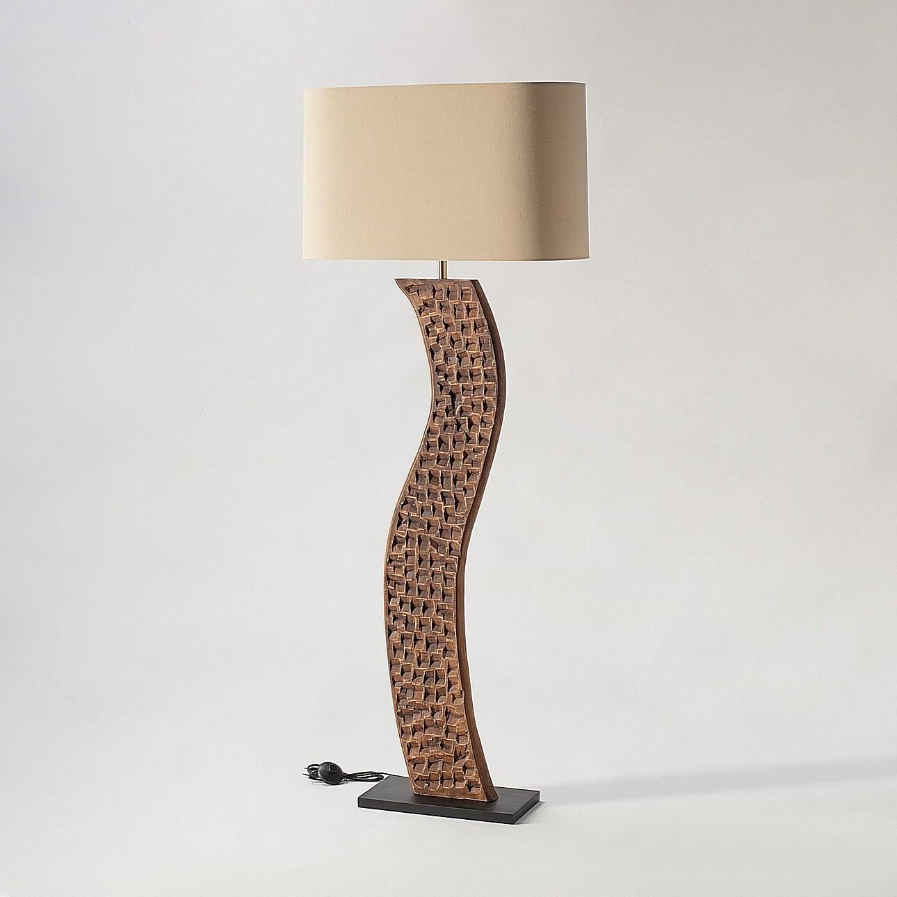 Lampa podłogowa z falistą, rzeźbioną podstawą i owalnym abażurem z lnu. Lampa Vena to dekoracyjny model, który łączy w sobie naturalne piękno drewna mango z wyrazistym, rzeźbionym wzorem. Jej smukła, falista forma nadaje lekkości i ruchu, a geometryczne, fakturowane zdobienia dodają jej charakteru inspirowanego naturą i rękodziełem. Owalny abażur z grubego lnu w kolorze beżowym subtelnie rozprasza światło, tworząc w pomieszczeniu przytulny klimat.Dzięki swojej wysokości (171cm) lampa doskonale sprawdzi się w roli dodatkowego światła w salonie, jadalni czy sypialni, a jednocześnie stanie się oryginalnym elementem aranżacyjnym. Świetnie uzupełni wnętrza w stylu boho, rustykalnym, naturalnym, ale także wprowadzi przyjemny kontrast w bardziej nowoczesnych przestrzeniach.To propozycja dla osób, które cenią design z duszą i naturalne materiały.Wymiary: szer. 70 cm, gł. 25 cm, wys. 171 cmMateriał: drewno mango (podstawa), len (abażur)Kolor: naturalne drewno / beżowy abażurInformacje dodatkowe: brak żarówki w zestawie, oprawka na żarówki E27