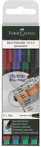 Faber-Castell 1513 04 - Marker permanentny MULTIMARK, moc: F, opakowanie 4 sztuki, zawartość: 1x czerwony, niebieski, zielony, czarnynp. do kamienia, drewna, metalu, szkła, płyt CD itp.wyjątkowo odporny na działanie światła i wodyz wbudowaną specjalną gumkąwymazuje na prawie wszystkich gładkich …