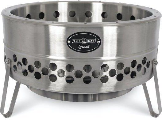 Feuerhand Tyropit  Petro Palenisko Ogrodowe  Innowacyjne palenisko o niskiej emisji dymu idealne do Twojego ogrodu zmieni Twój taras! Palenisko w stylu industrialnym emanuje atrakcyjnym urokiem i niepowtarzalnym designem. Specjalnie zaprojektowana konstrukcja zapewnia efektywną pracę, a tym samym zapewnia przyjemne godziny  spędzone w blasku płomieni.  Zalety:  Tyropit składa się z dwuściennego korpusu ze stali nierdzewnej z obwodowymi otworami wentylacyjnymi. W rezultacie drewno pali się prawie bez dymu i sadzy. Żar pozostaje na wyjmowanym ruszcie, pozostałości po spalaniu spadają do popielnika. Przy średnicy paleniska 50,6 cm jest również miejsce na duże kłody. Ze względu na materiał ze stali nierdzewnej Tyropit jest wyjątkowo trwały i z czasem uzyskuje niepowtarzalną patynę. To odbarwienie materiału jest charakterystyczne i zależy od stopnia wygrzania i użytego rodzaju paliwa. Bezpieczna komora paleniskowa wykonana komfortowo i bezpiecznie Feuerhand Tyropit został opracowany w taki sposób, aby oprócz efektywnej pracy był również łatwy w obsłudze i czyszczeniu. W środku paleniska znajduje się wyjmowana popielnica ze zintegrowaną kopułą iskrową, na której leży wyjmowany ruszt. Ruszt na węgiel drzewny i popielnik również przyczyniają się do optymalnego spalania, ponieważ żar jest zachowywany na ruszcie a pozostałości spalania gromadzą się w popielniku co zapobiega duszeniu się rozgrzewającego ognia, popiół można później łatwo usunąć. Trzy stabilne nogi zapewniają pewne trzymanie na podłodze tarasu ale także na trawniku. Osłona termiczna chroni wrażliwe powierzchnie. Specyfikacja: Średnica podstawy: 62,3 cm, średnica na górze zewnętrzna: 57,8 cm, średnica przy górnej krawędzi wewnętrzna: 50,6 cm, wysokość: 35,5 cm, materiał: Stal nierdzewna waga: 12,1 kg