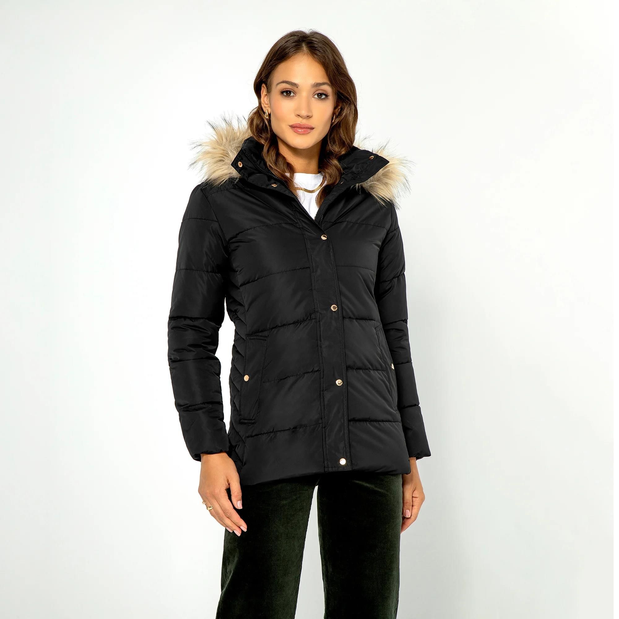 Kurtka damska pikowana z monogramem Kod produktu: 99-9D-901-1-2XL Zimowa elegancja – damska kurtka z pikowaniem Przywitaj zimę z odrobiną luksusu i wyjątkowego stylu dzięki tej eleganckiej damskiej kurtce . Stworzyliśmy ją z myślą o kobietach, które pragną czuć się pewnie i modnie, niezależnie od warunków pogodowych. Dzięki starannie dobranym detalom ta kurtka z pewnością stanie się Twoim ulubionym elementem garderoby w chłodniejsze dni. Dla kogo? Stworzona dla nowoczesnych kobiet, które chcą połączyć elegancję z praktycznością. Doskonała zarówno na co dzień, jak i na specjalne okazje, zapewnia ciepło i wyjątkowy wygląd. Nasza rada : Wybierz skórzane czółenka lub botki na niewielkim obcasie, a całość dopełnij minimalistyczną torbą na laptopa , subtelną biżuterią i zegarkiem w stonowanym kolorze, aby stworzyć wygodną stylizację. Kluczowe cechy: Materiał: Poliester użyty na zewnątrz kurtki jest odporny na działanie wiatru i wilgoci, co sprawia, że jest idealnym wyborem na zimowe warunki. Podszewka: Wykonana z wysokiej jakości poliestru , podszewka zapewnia nie tylko dodatkowe ciepło, ale także komfort noszenia. Praktyczność: Odpinany kaptur dodaje kurtce elegancji i ciepła. Dodatkowo regulowany ściągacz pozwala dostosować kaptur do indywidualnych potrzeb, zapewniając lepszą ochronę przed wiatrem i opadami. Kieszenie: Kurtka wyposażona jest w dwie ukośne kieszenie na przodzie , które są zarówno funkcjonalne, jak i stylowe. Zapięcie: Zamek błyskawiczny w połączeniu z zatrzaskami gwarantuje pewne zamknięcie i dodatkową ochronę przed wiatrem. Detale: Pikowanie, monogram producenta na lewym ramieniu oraz sygnowane guziki , nadają kurtce charakter i unikalny styl. Wypełnienie : 100% poliester. Skład : Materiał zewnętrzny: 100% poliester; podszewka: 100% poliester. Odkryj, jak łatwo połączyć elegancję z funkcjonalnością – wybierz ten model kurtki i ciesz się zimą w pełnym stylu. materiał: poliester podszewka: poliester elementy metalowe: w kolorze złotym kolekcja: Odzież zapięcie: zatrzask, zamek kaptur: z kapturem długość odzieży: do bioder fason: puchowy, pikowany sezon: na jesień, na zimę styl: na zamek wypełnienie: 100% poliester