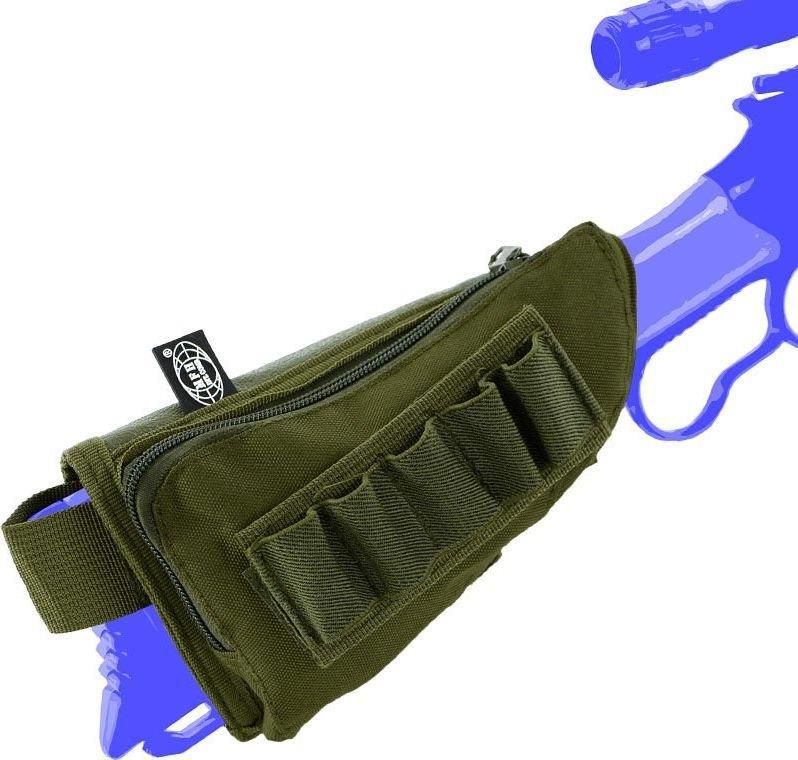 MFH RIFLE STOCK BULLET POUCH ŁADOWNICA NA KOLBĘ nowa produkt niemieckiej firmy MFH Int. Comp. dla snajperów, myśliwych, graczy ASG i do strzelectwa sportowego pozwala na dogodne przenoszenie zapasu amunicji wodoodporny nylon 1000D dwa wymienne panele na rzep na pociski karabinowe 7 szt. na naboje gładkolufowe 5 szt. kieszonka na akcesoria lub amunicję pasuje na większość modeli broni regulowany system mocowania - czteropunktowy miękka część policzkowa, obszyta sztuczną skórą wymiary 20 x 11 cm kolor OLIVE Uniwersalna ładownica na kolbę do karabinów i karabinków. Produkt niemieckiej firmy MFH Int. Comp. Przeznaczona dla snajperów i myśliwych, polecana miłośnikom ASG oraz sportowej broni pneumatycznej. Ładownica pozwala na przenoszenie zapasu naboi bezpośrednio na kolbie co zapewnia dogodny dostęp do amunicji. Wykonana z wytrzymałego, wodoodpornego nylonu 1000D. Wyposażona w dwa wymienne panele na rzep, przystosowana do przenoszenia pocisków karabinowych lub naboi broni gładkolufowej. Elastyczna taśma dopasowuje się do kształtu i wielkości łuski. Wyposażona w kieszonkę na zamek która przyda się do noszenia dodatkowej amunicji, środków do konserwacji, zapasowej baterii do repliki, kulek, śrutu lub telefonu. Nowatorski system mocowania na kolbie gwarantuje pewne trzymanie na kolbie (czteropunktowy), zabezpiecza przed przesuwaniem lub obracaniem się na kolbie. Regulowane paski na rzep pozwalają dopasować ładownicę do każdej kolby. Część policzkowa wypełniona miękką pianką i obszyta antypoślizgową skórą syntetyczną - zapewnia komfort podczas strzelania.