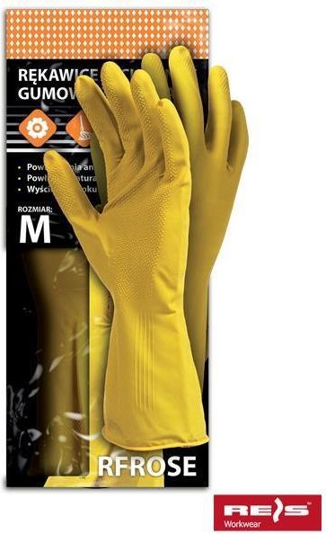Minimalna ilość zamówienia to opakowanie zawierające 12 par (sprzedaż tylko w pełnch opakowaniach).Cena podana jest za parę rękawic. RFROSE Rękawice ochronne gumowe flokowane. 100% kauczuk naturalny. Wewnętrzna powierzchnia pokryta flokiem (pyłem bawełnianym), co ułatwia wkładanie i zdejmowanie rękawic oraz zapobiega poceniu się rąk w czasie użytkowania. Na części chwytnej chropowata struktura dzięki czemu rękawiczki zyskują lepszą przyczepność. Grubość części chwytnej: 0,46 mm. Odporne na rozciąganie. Wysoka odporność na detergenty i środki piorące. Doskonale sprawdzą się w gospodarstwach domowych. Wykorzystywane do ogólnych prac mechanicznych. Każda para pakowana w osobną torebkę, dzięki czemu świetnie się prezentują i są idealne na wszelkiego rodzaju prezentacje. Potocznie zwane jako floki lub rękawice gospodarcze. Marka: REIS Produkt polecany dla branż: Obsługa techniczna obiektów w tym hoteli, prace domowe oraz porządkowe, kwiaciarnie,Rolnictwo Ogrodnictwo Leśnictwo Łowiectwo Rybactwo