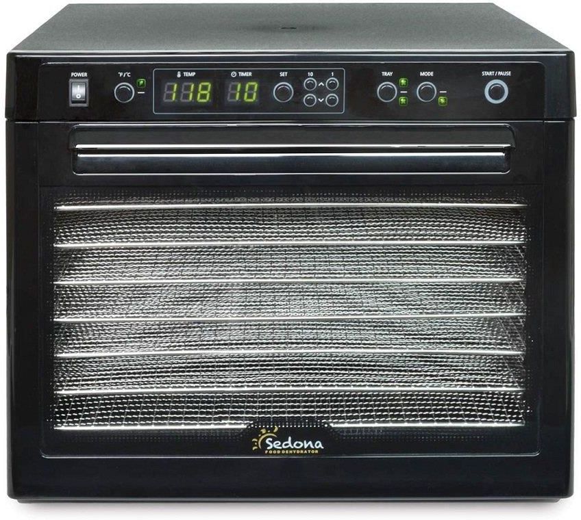 Sedona Raw Food Classic Stal to dehydrator, renomowanej firmy Tribest. Funkcjonalna suszarka do owoców, warzyw i ziół do domowych kuchni. Posiada zwartą, kompaktową konstrukcję o 9 stalowych tackach oraz ociekacz dehydratora. Gdy chcemy wysuszyć mniejszą ilość, to możemy uruchomić dehydratortylko w połowie oszczędzając energię. Model ten posiada podział na dwie komory suszenia. Urządzenie to nie ma konkurencji na rynku, a dodatkowo jest bardzo łatwe w obsłudze i codziennym użyciu. Wszystkie tacki, to tacki bez zawartości bisfenolu czyli wolne od BPA (BPA free). Panel sterowania zapewnia możliwość pełnej kontroli procesu suszenia – do dyspozycji użytkowników oddano możliwość manualnego sterowania lub skorzystania z gotowych programów. W dehydratorze tym ustawiamy określony czas pracy lub tryb stałego suszenia. Urządzenie posiada cyfrowy timer z kontrolą temperatury. Dwa wentylatory o dużej mocy zapewniają przepływ powietrza. W samej pracy jest również cichym, nieprzeszkadzającym urządzeniem. Szklane drzwi pozwalają kontrolować stan suszenia bez konieczności przerywania procesu lub otwierania dehydratora. Suszarka do żywności Sedona Raw Food Classic Stal skutecznie usuwa wilgoć z warzyw, owoców, ziół, grzybów lub mięsa. Dehytrator może pracować w zakresie do 99 godzin w trybie połowy pracy oraz do 150 godzin w trybie pracy całego dehydratora.