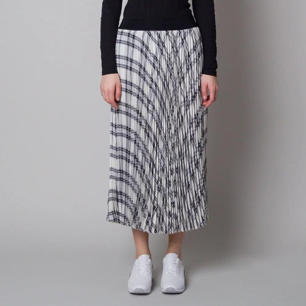 Spódnica plisowana Spódnica plisowana w uniwersalnym i praktycznym rozmiarze midi. Posiada elastyczną gumę w pasie, która świetnie modeluje sylwetkę. Dobrze komponuje się z bluzką lub swetrem wpuszczonym do środka. - Kolor: biała w szarą kratkę - Typ: plisowana, rozkloszowana - Wykończenia: granatowa guma w pasie - Długość spódnicy: 78 cm - Obwód gumy w pasie: 68 cm przed rozciągnięciem - Tkanina: 100% poliester - Wyprodukowano w UE - Gwarancja: 24 m-ce - Zalecenia: prać ręcznie, nie wirować